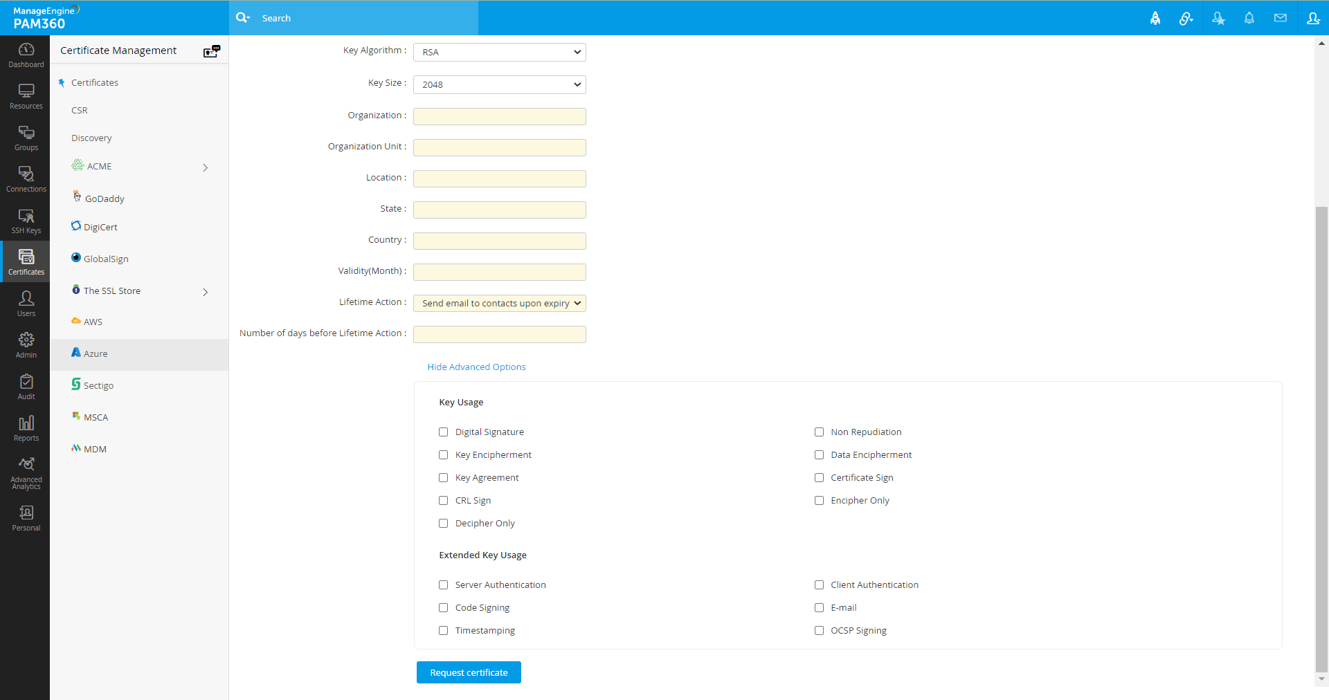 PAM360では、必要なAzure key vaultでAzure認証情報の要求SSL証明書要求を作成できます。同じ証明書名を入力して、既存の証明書の新しいバージョンを作成することもできます。PAM360で作成されたすべての証明書要求は、Azureポータルで自動更新されます。以下の手順に従ってください: