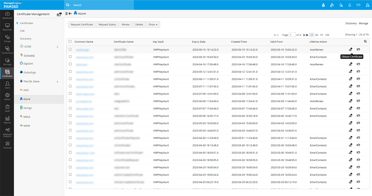 PAM360は、Microsoft Azure Key Vault — SSL証明書管理のクラウドサービスと統合します。この統合でユーザーは、PAM360リポジトリにインポートすることで、Azure Key Vaultに保存したSSL証明書を要求、更新および管理できます。証明書要求を自動更新し、Azure Key Vaultに保存および管理されるSSL/TLS証明書のエンド・ツー・エンドライフサイクル管理を、PAM360 Webインターフェイスから直接、自動化できます。