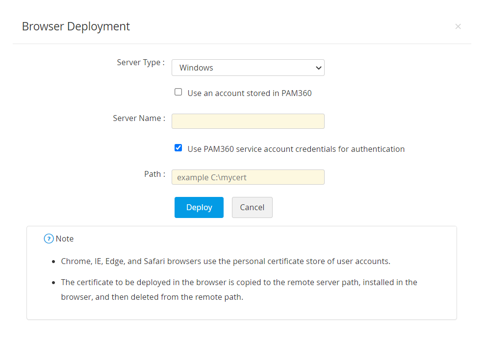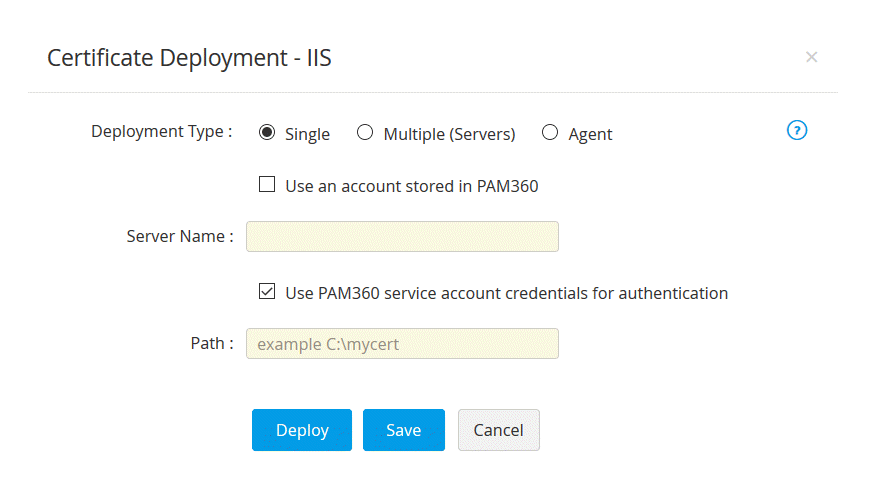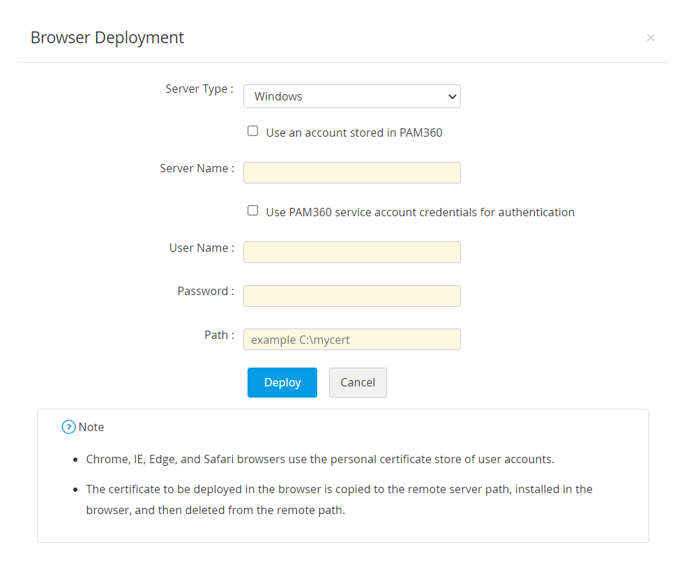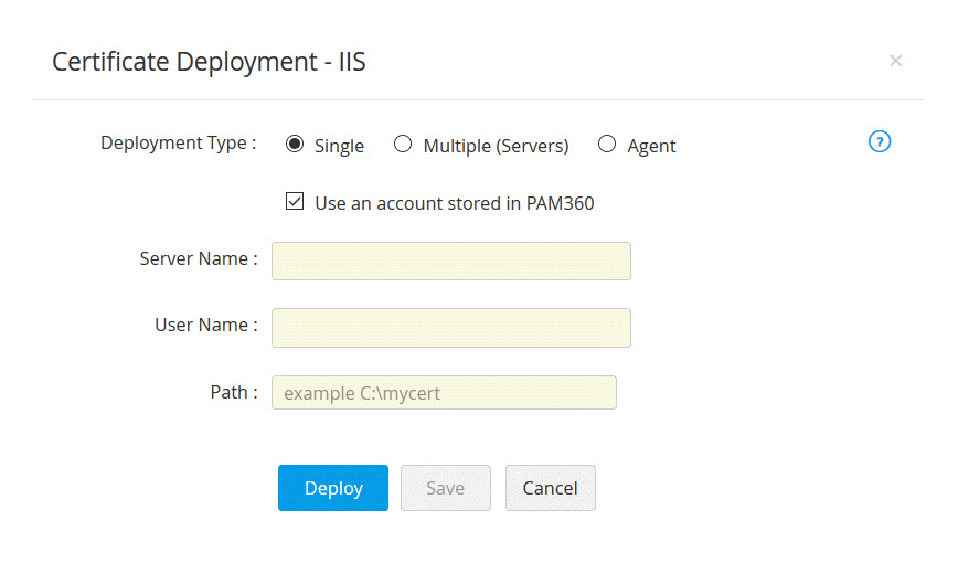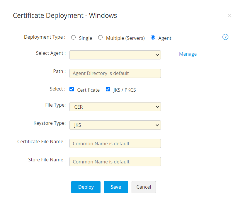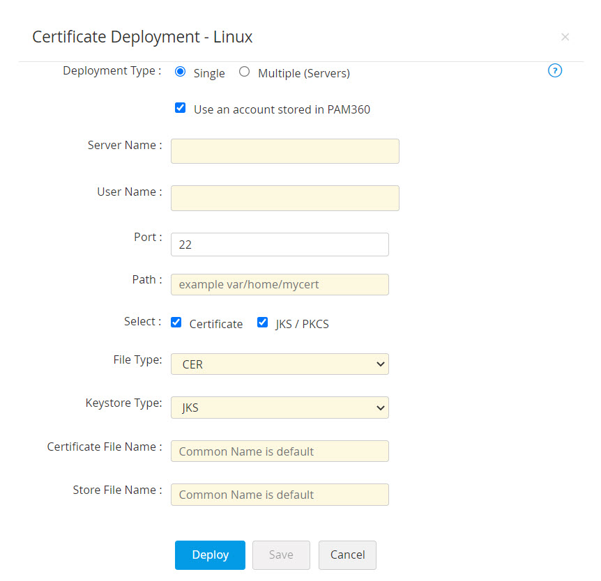 - 開いた証明書の展開ウインドウで、サーバータイプを選択し、必要な詳細事項を入力します。証明書は、指定されたパスの指定されたサーバーに展開されます。
