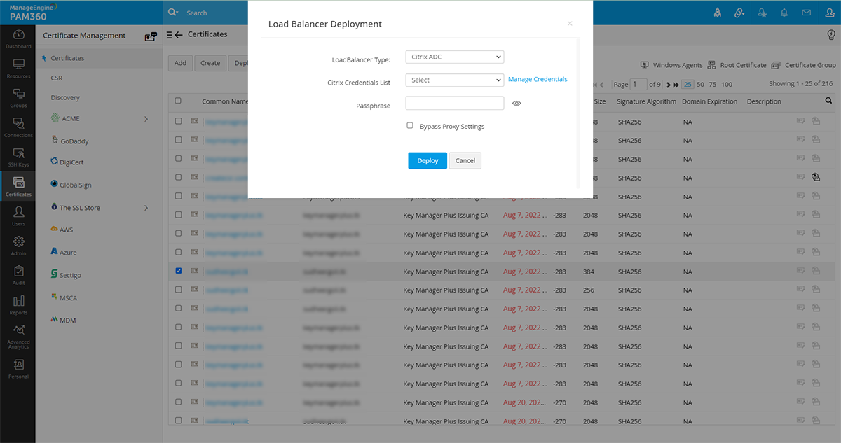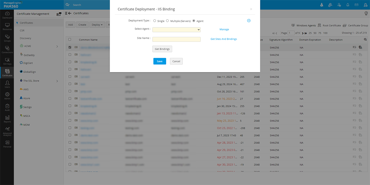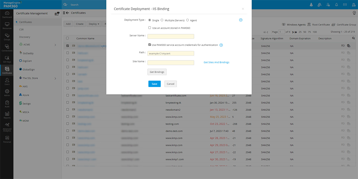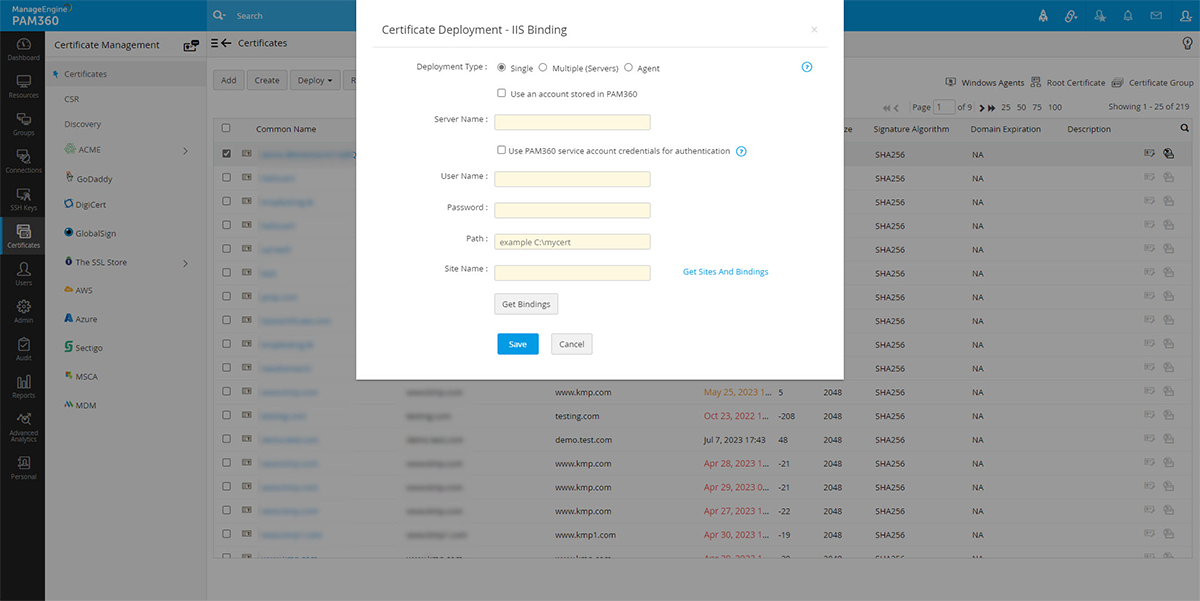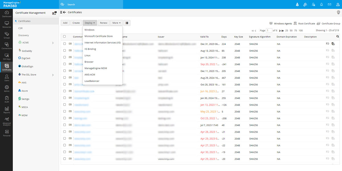 通常、証明機関(CA)から取得したSSL証明書はリポジトリに保存され、適切なターゲットシステムに手動で展開されます。PAM360は、正しいターゲットシステムのリポジトリから証明書を自動的に展開します。PAM360を使って、要件にあわせて、各種システムで証明書を個別に、またたは一括で展開することができます。また、Key Manager Plusエージェントを使って、PAM360 Serverがあるドメイン外のDMZにあるサーバーで証明書を展開することもできます。