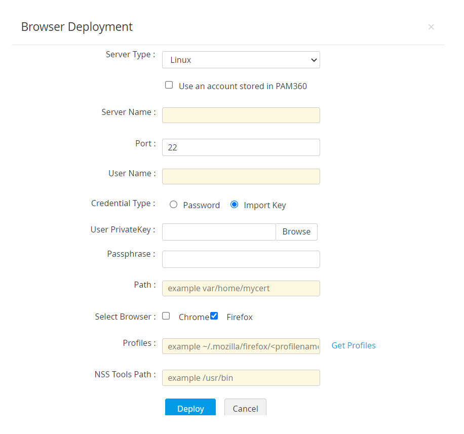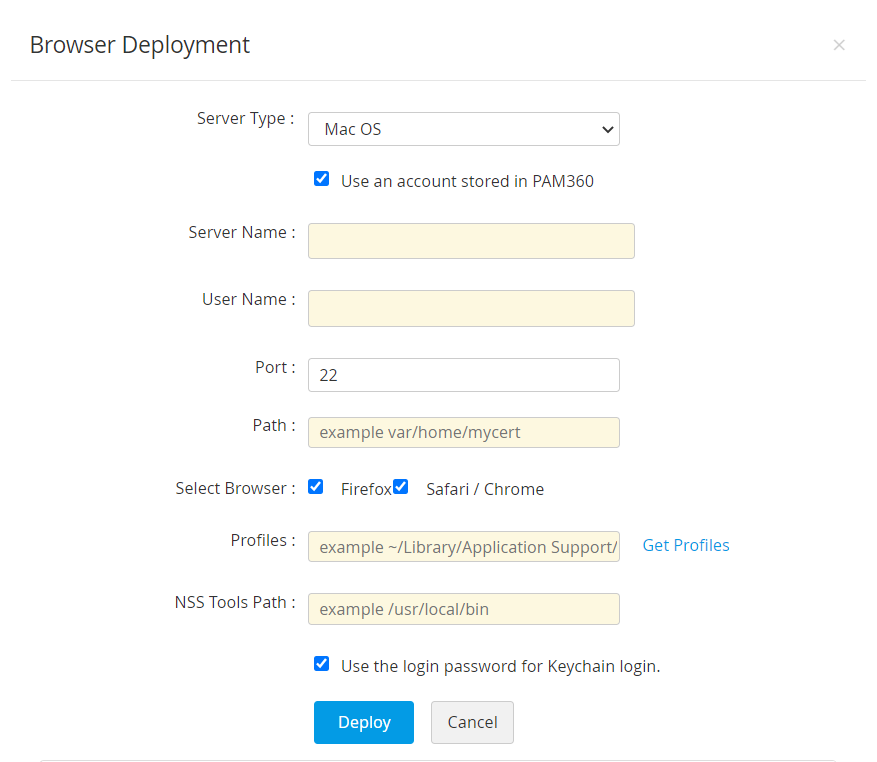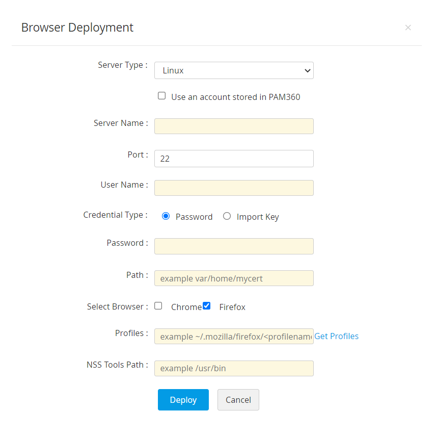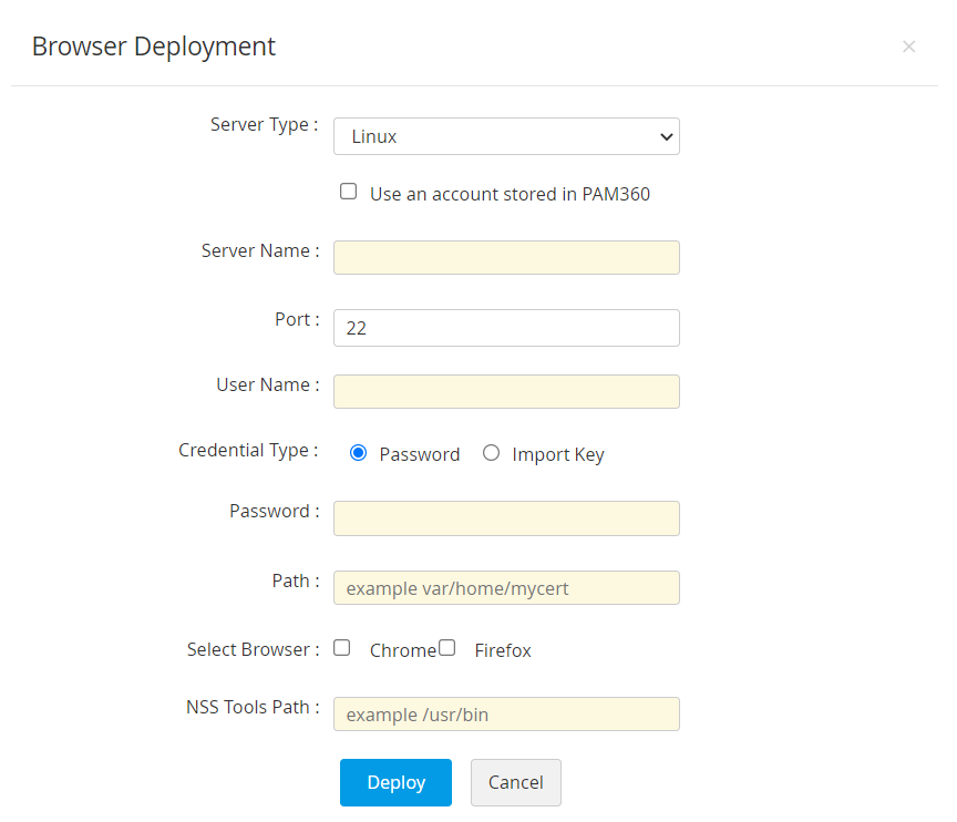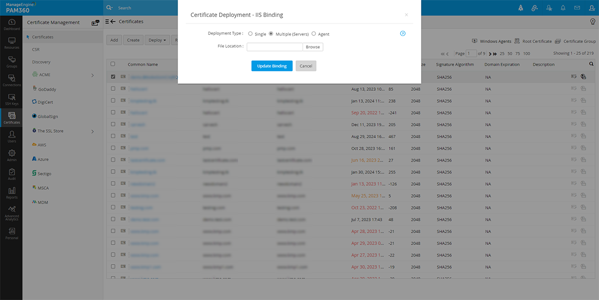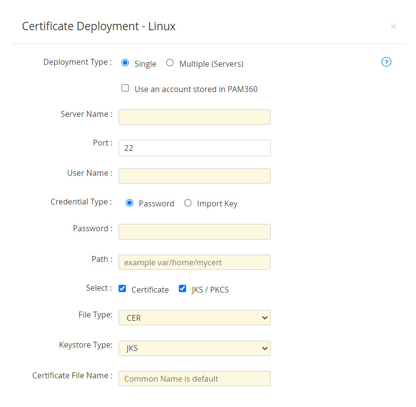 PAM360を使って、選択したSSL証明書をターゲットサーバーに直接展開することができます。SSL証明書をターゲットサーバーに展開するには: