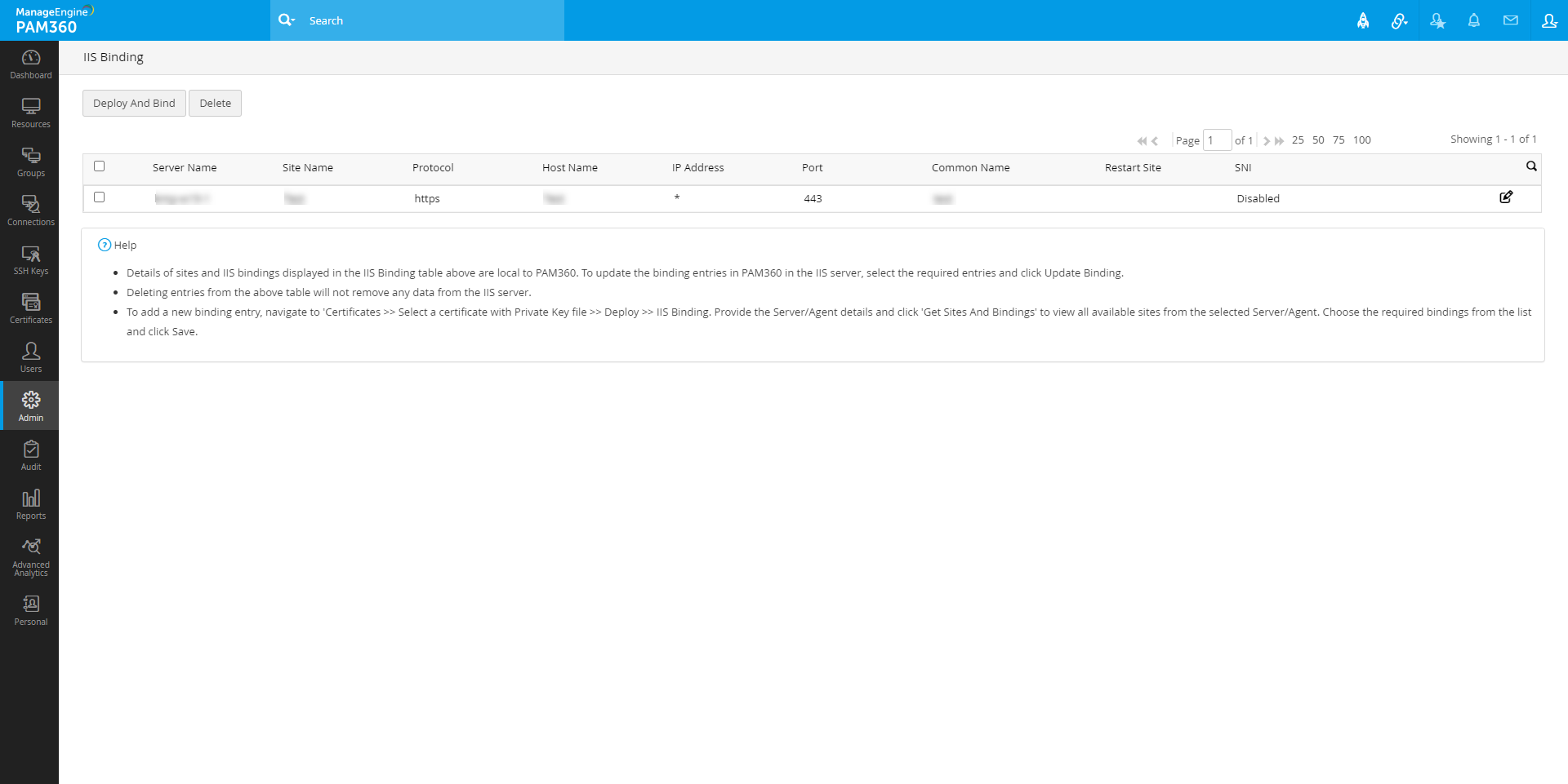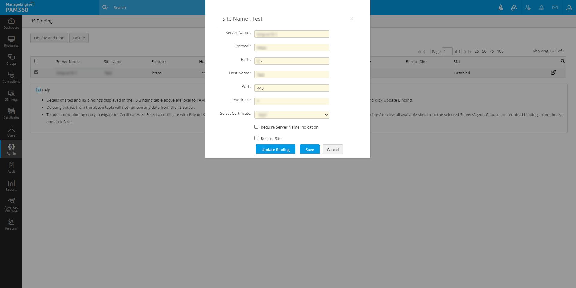 - 上のIISバインディングテーブルに表示されるサイトとIISバインディングの詳細は、PAM360にローカルのものです。ここでバインディングエントリをIISサーバーからのエントリで更新するには、必要なエントリを選択し、[バインディングの更新]をクリックします。