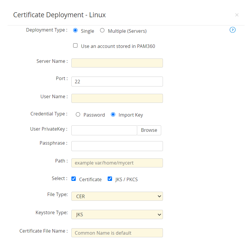 - 単一サーバー展開の場合、必要な詳細を提供します:サーバー名、ポート(ポート22がデフォルトで割り当てられています)、ユーザー名、パスワード、パス。オプションで、証明書を有効にしてファイルタイプを選択し、証明書ファイル名を指定するか、および・またはJKS / PKCSを有効にしてキーストアタイプを選択してストアファイル名を指定できます。