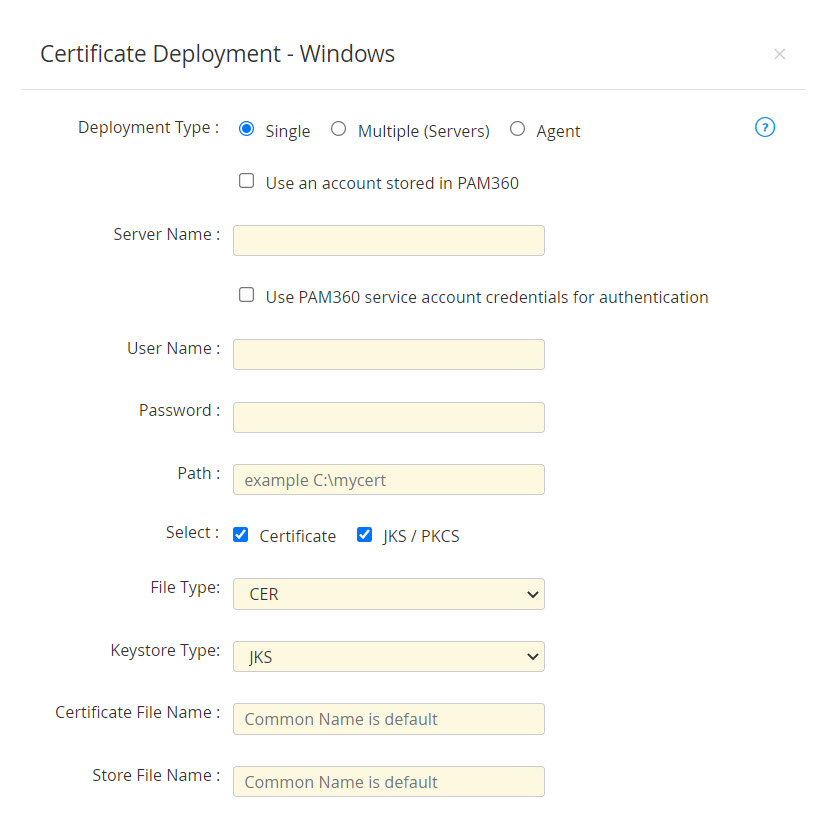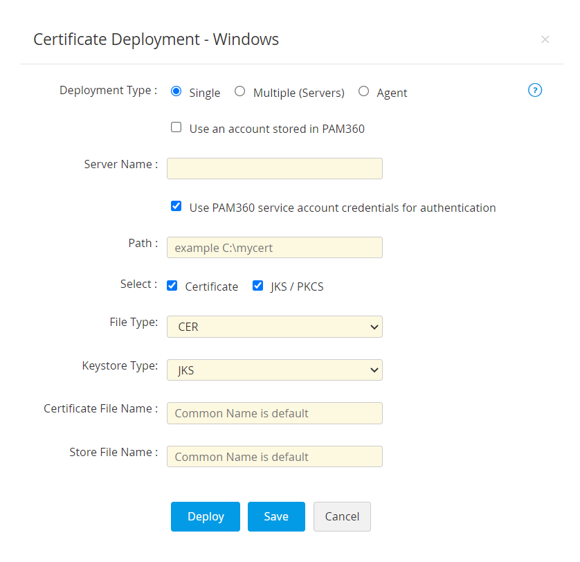 - 展開タイプをエージェントとして選択する場合、PAM360エージェントのホスト名を[エージェントを選択]ドロップダウンから選択し、エージェントマシンに宛先ファイルパスを入力します。宛先パスが指定されていない場合、エージェントのインストールパスがデフォルトとして使用されます。オプションで、証明書を有効にしてファイルタイプを選択し、証明書ファイル名を指定するか、および・またはJKS / PKCSを有効にしてキーストアタイプを選択してストアファイル名を指定できます。