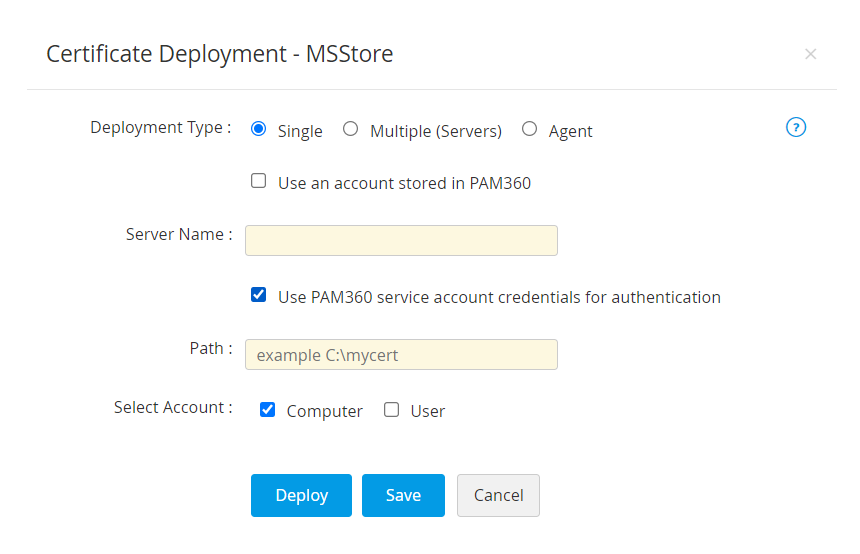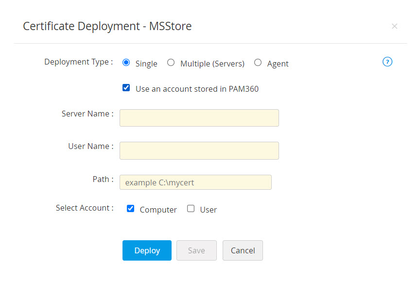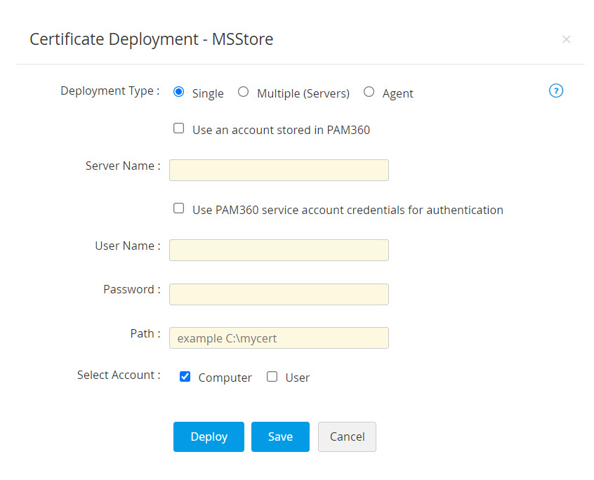 メモ:エージェント展開の場合、PAM360エージェントの最新バージョン(5900)を、証明書の展開先のユーザーアカウントで実行する必要があります。