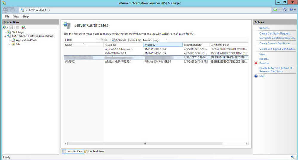 下の手順にしたがって、証明書をIIS Serverに展開します。ただし、この手続きでは、サーバーに証明書が展開されるのみで、IISバインディングは個別に実行する必要があります。