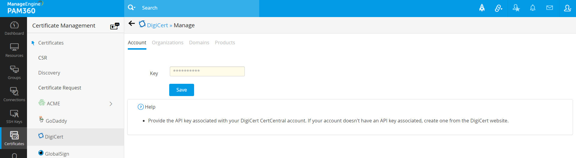 DigiCert証明書をPAM360から要求および管理するには、PAM360アカウントをDigiCert CertCentralアカウントとリンクする必要があります。これを行うには、CertCentral APIキー詳細をPAM360に適用する必要があります。