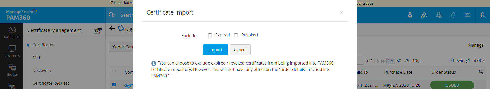 - [有効期限切れ]または[取り消し済]オプションを選択し、インポート中、有効期限切れまたは取り消し済証明書をPAM360証明書リポジトリに追加される対象から除外します。これで、SSL証明書のライセンスカウントが、PAM360に取り込んだオーダー詳細の数に影響を与えることなく、インストール時に保存できます。