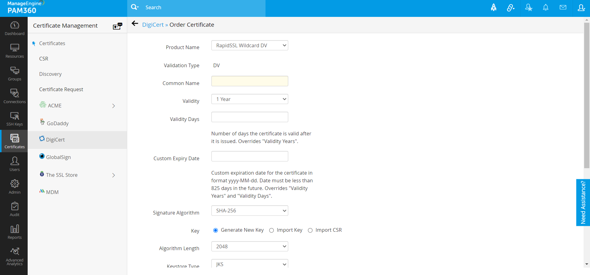 PAM360は、DigiCert証明書署名認証と統合し、エンタープライズは、中央プラットフォームからDigiCert,が署名および発行したWebサーバー証明書のエンド・ツー・エンド管理を自動化します。本書では、DigiCertがPAM360のWebインターフェイスから直接発行したSSL証明書のライフサイクルを管理する手順について説明します。これらの操作には、既存オーダーのインポート、証明書要求、プロビジョニング、展開、および証明書の更新が含まれます。