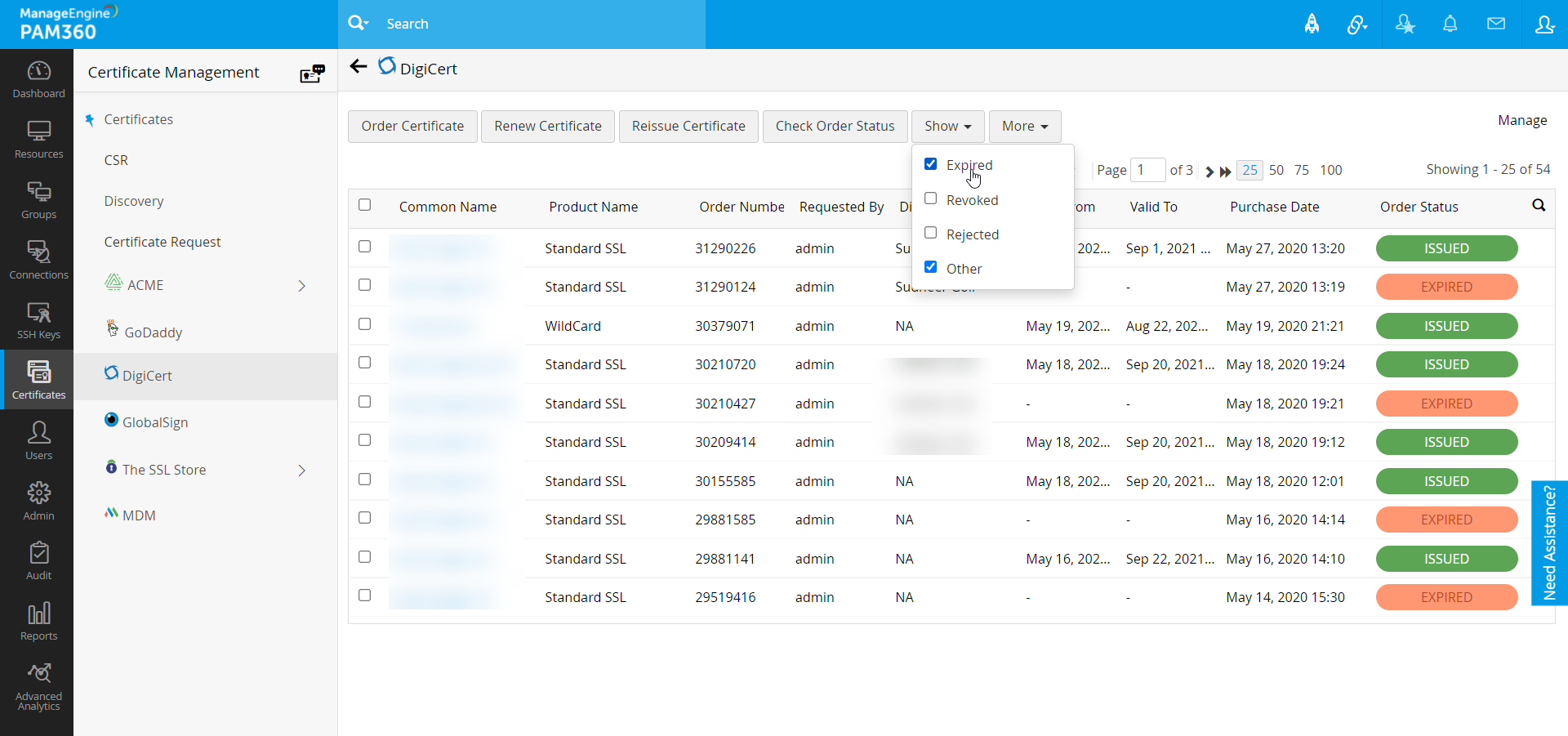 DigiCert CertCentralアカウントと関連づけられた既存証明書オーダーがすべて、PAM360リポジトリにインポートされます。