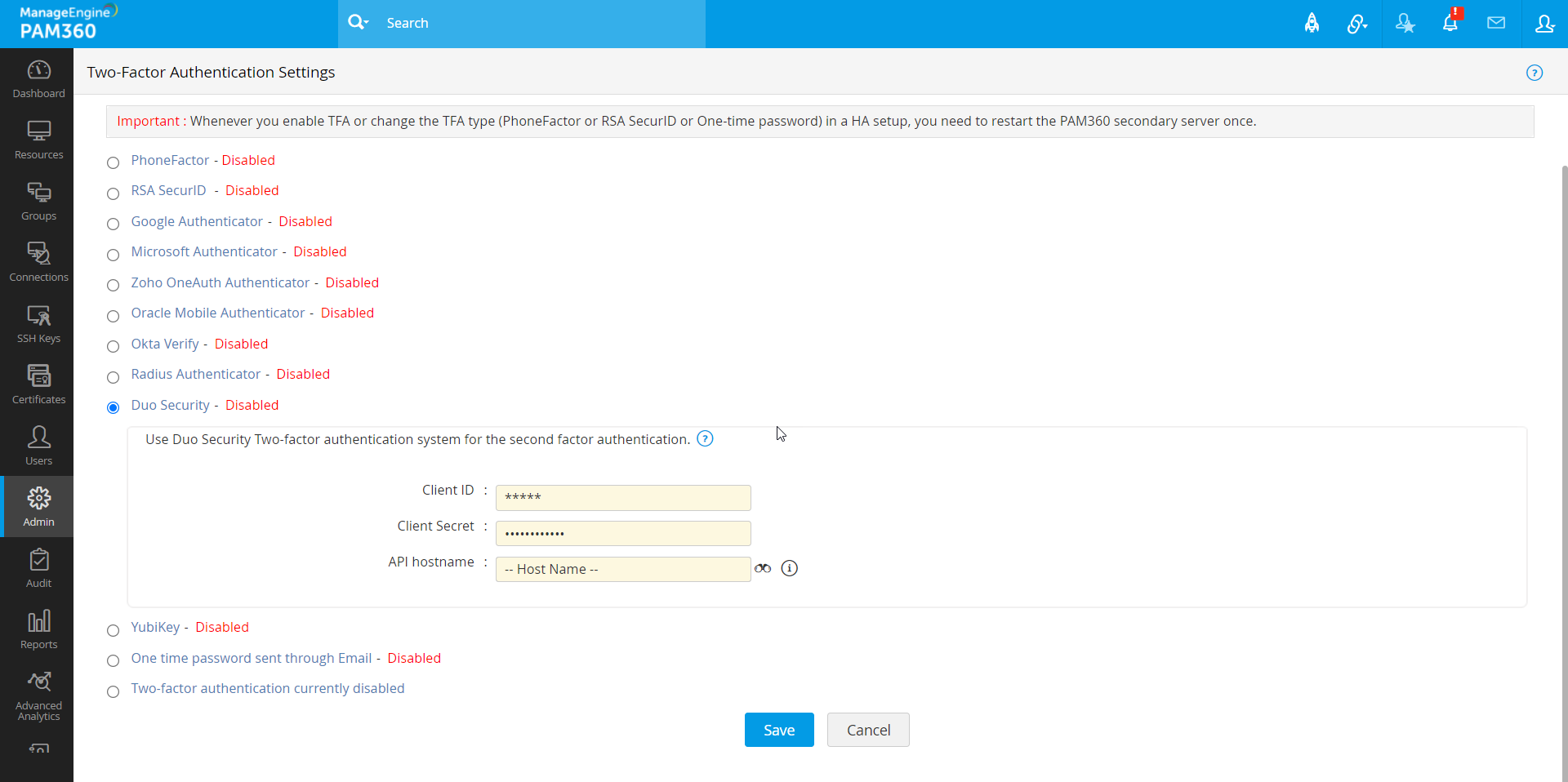 TFAを有効にするときは必ず、またはTFAタイプを変更する(PhoneFactorまたはRSA SecurID、ワンタイムパスワード、RADIUSあるいはDuo)、および高可用性を構成した場合、PAM360セカンダリサーバーを一度再起動する必要があります。