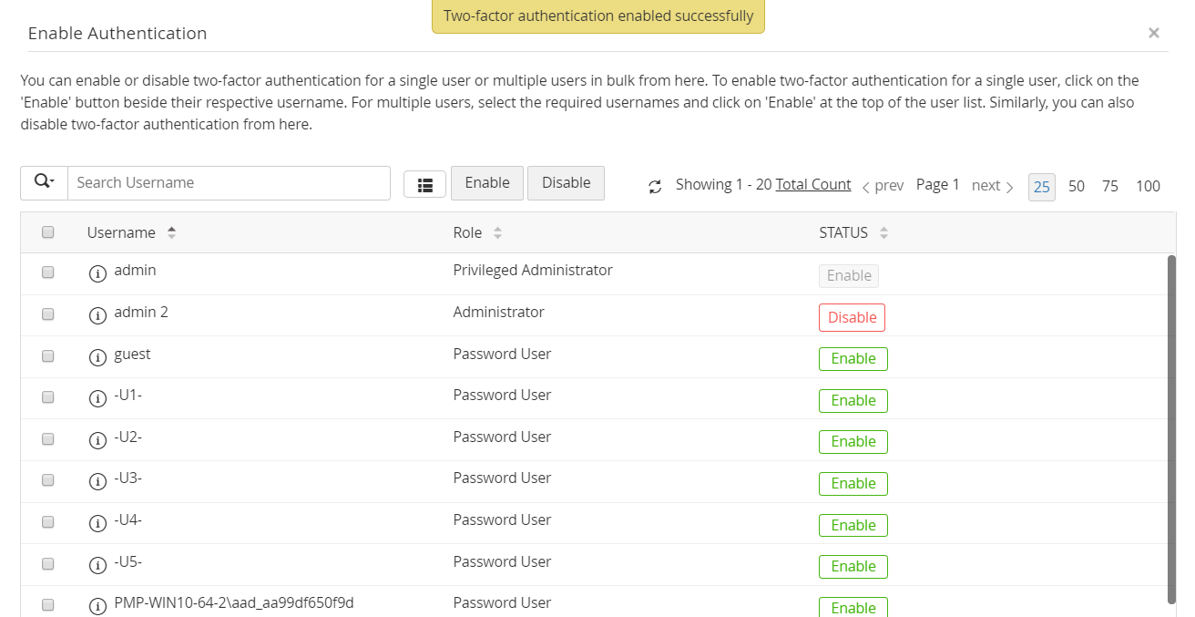 - 単一ユーザーまたは複数ユーザーは一括で、二要素認証を有効または無効にできます。単一ユーザーに二要素認証を有効にするには、各ユーザー名の横にある[有効化]ボタンをクリックします。複数ユーザーの場合は、必要なユーザー名を選択し、ユーザーリスト上部の[有効化]をクリックします。同様に、ここから、二要素認証を[無効化]することもできます。