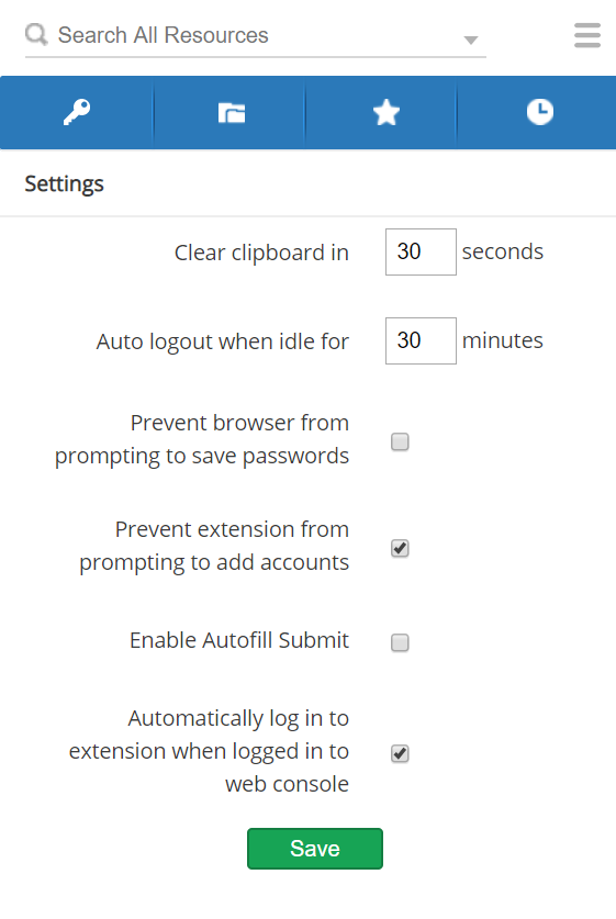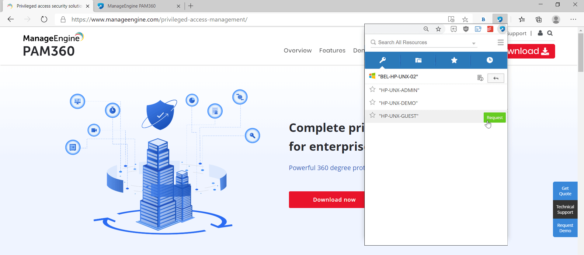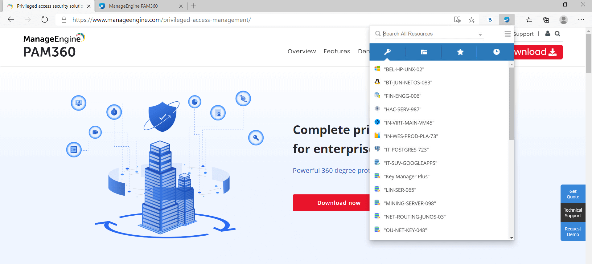 拡張機能により、パスワード要求の送信と承認、パスワードのWebサイトおよびWebアプリケーションへの自動入力、自動ログオンゲートウェイのセットアップによるRDPとSSHセッションの起動等、特権アクセス管理操作ができます。拡張機能では、すべてのパスワード、リソースグループ、お気に入りおよび最近使用したリソースを表示でき、また、リソースを検索することもできます。