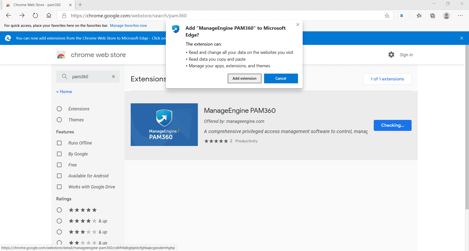これで、PAM360拡張機能がMicrosoft Edgeに正常に追加されます。