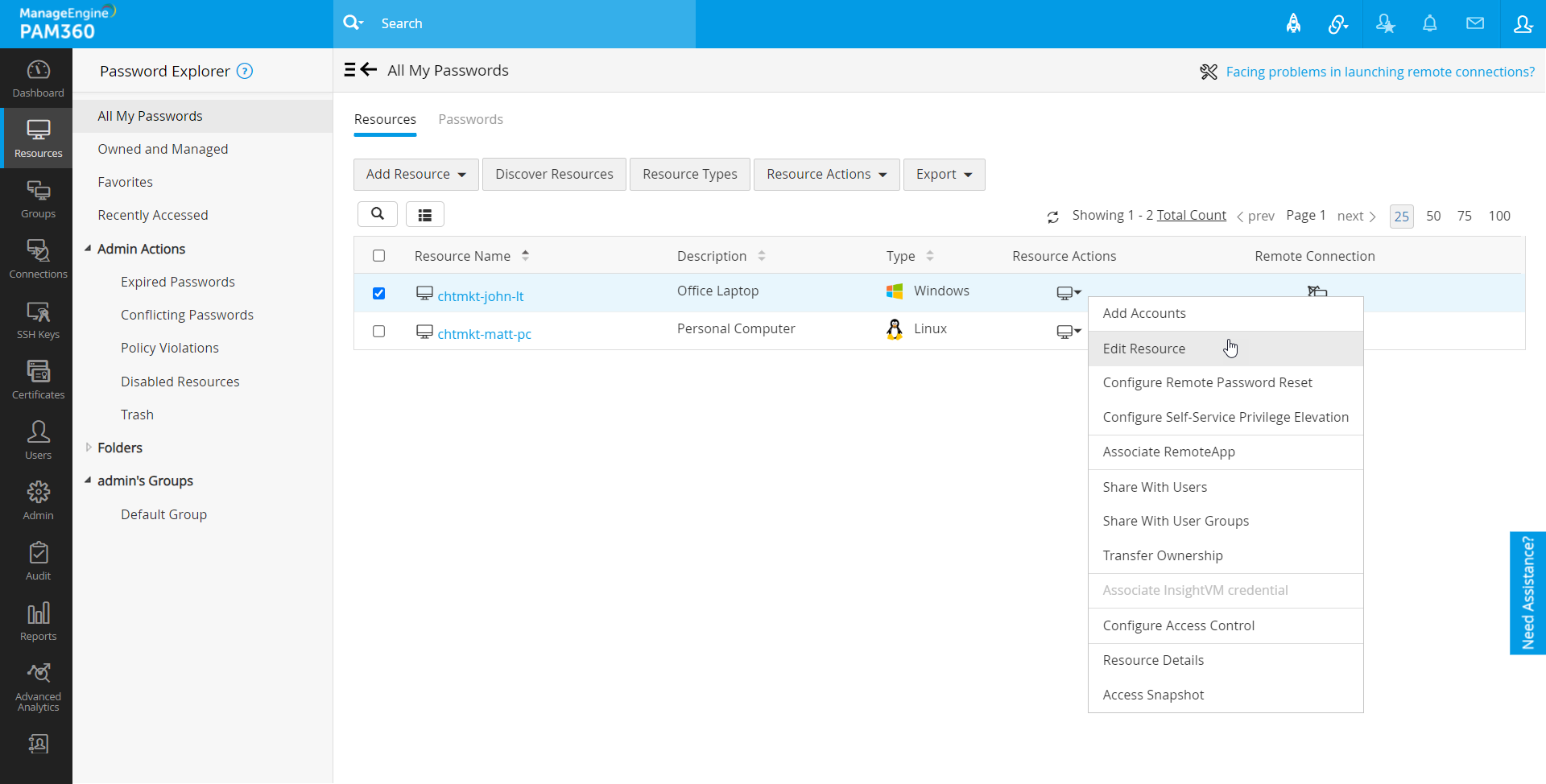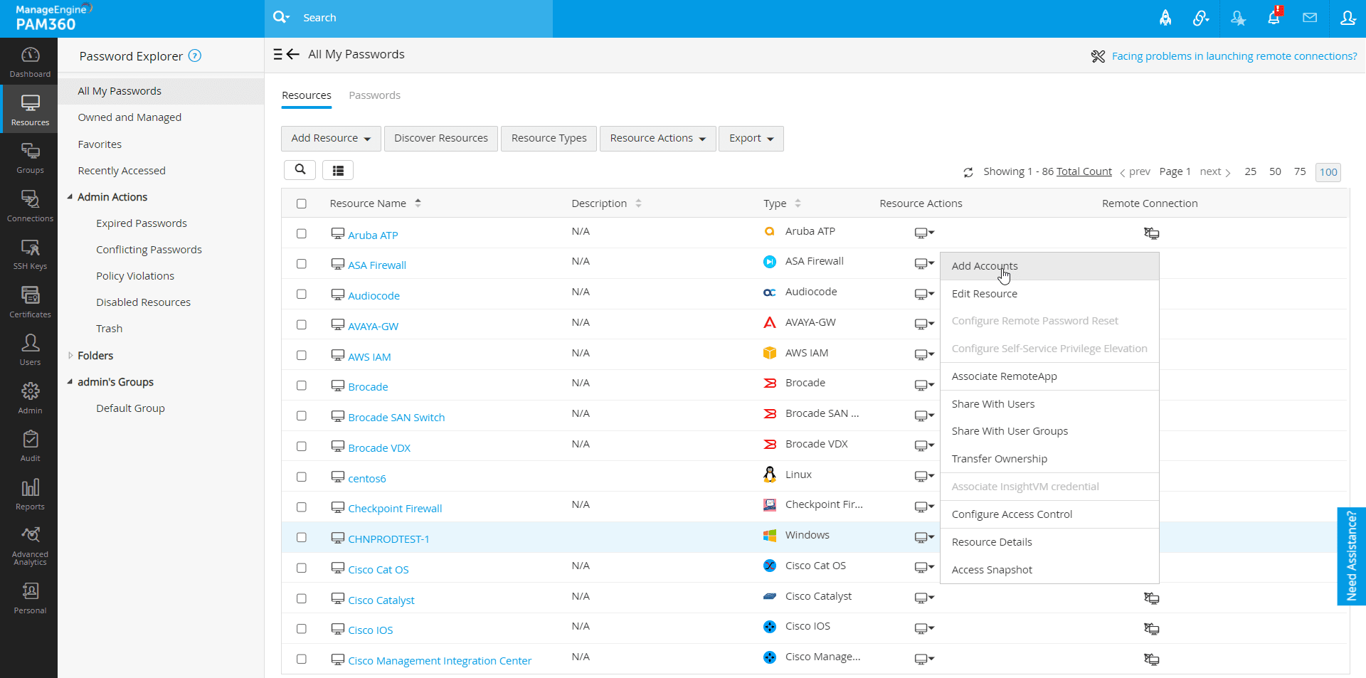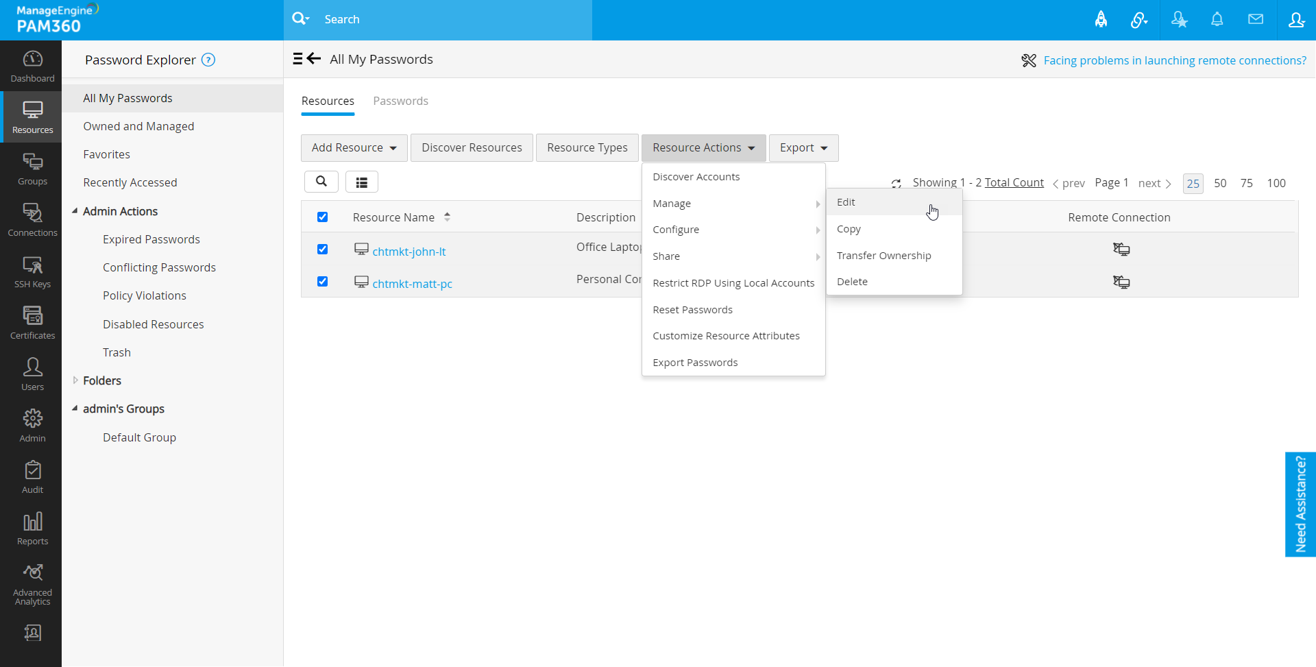 [リソース]タブから追加されたすべてのリソースを管理できます。リソースURL、パスワードポリシー、ドメイン名等、リソースの属性と関連づけられたアカウントのいずれかを必要に応じていつでも編集します。リソースをゴミ箱に一時移動するか、必要なくなった場合は、完全に削除することもできます。