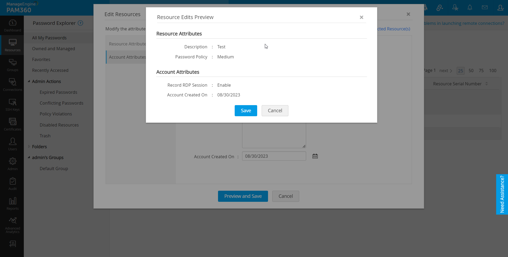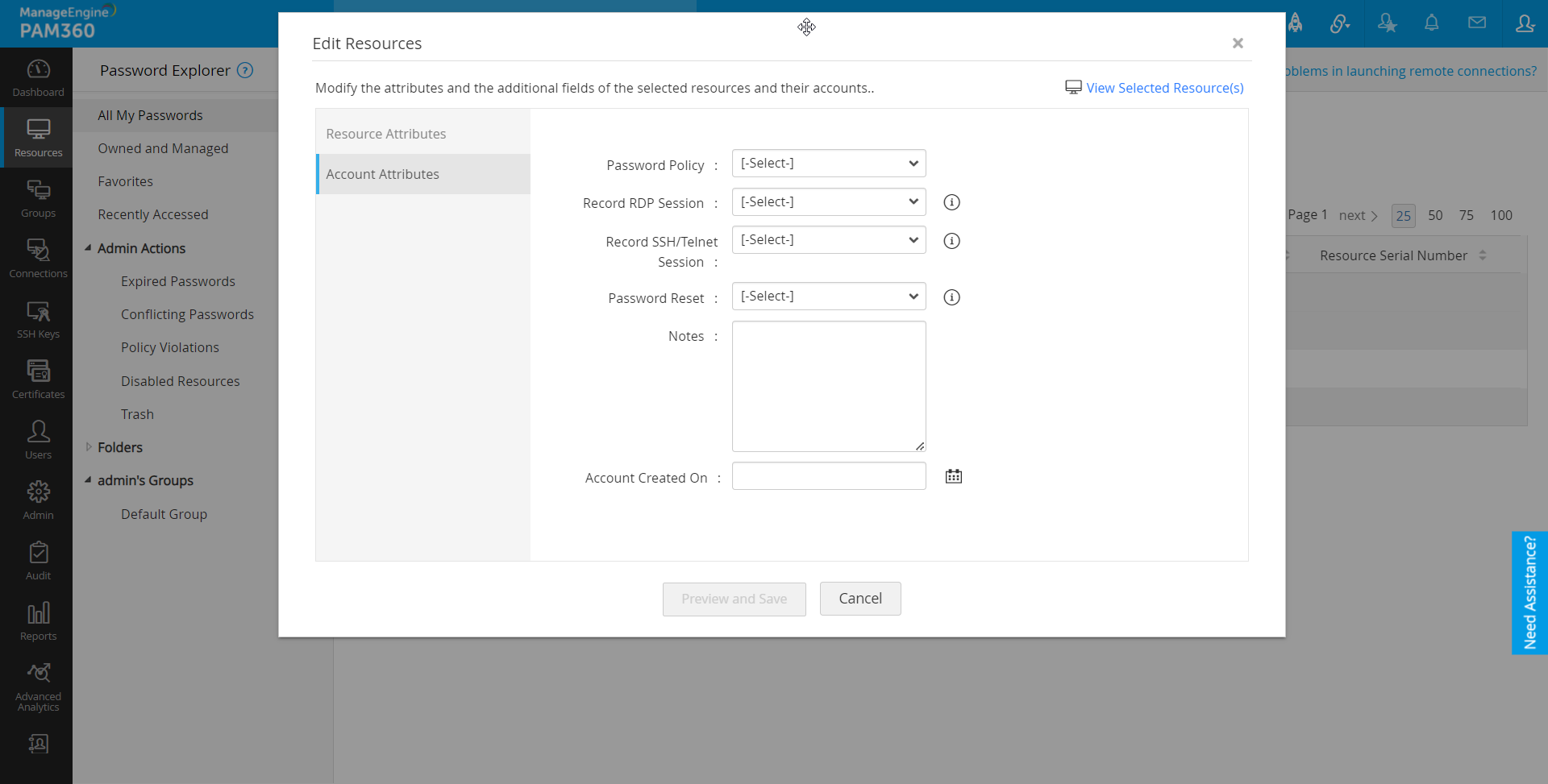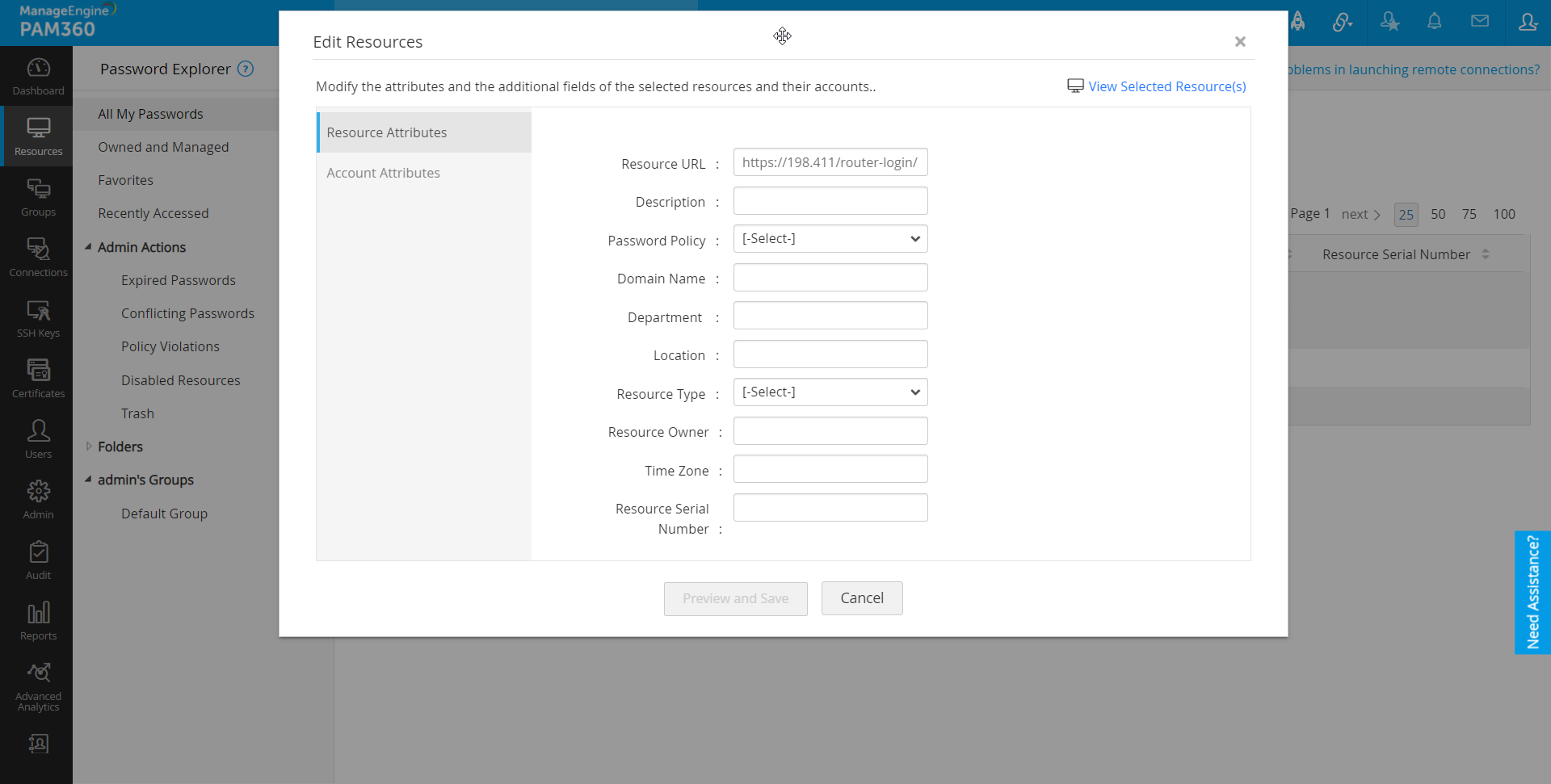 - リソースを一括編集するには、必要なリソースを選択し、上部で[リソース操作] >> [管理] >> [編集]順にクリックします。これで、リソースを編集ウインドウが開きます。ここで、属性と、選択したリソースとそのアカウントの追加フィールドを修正できます。