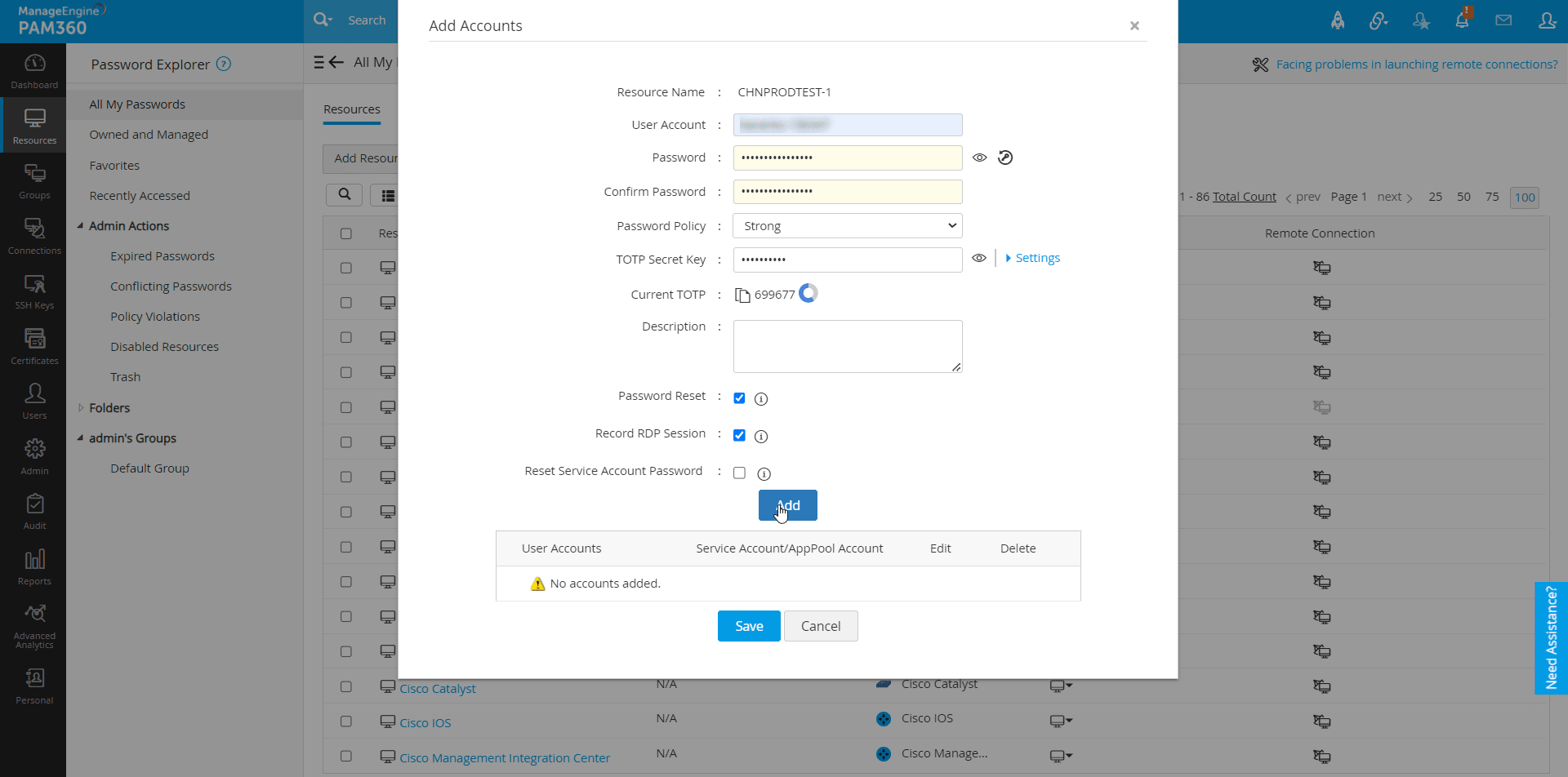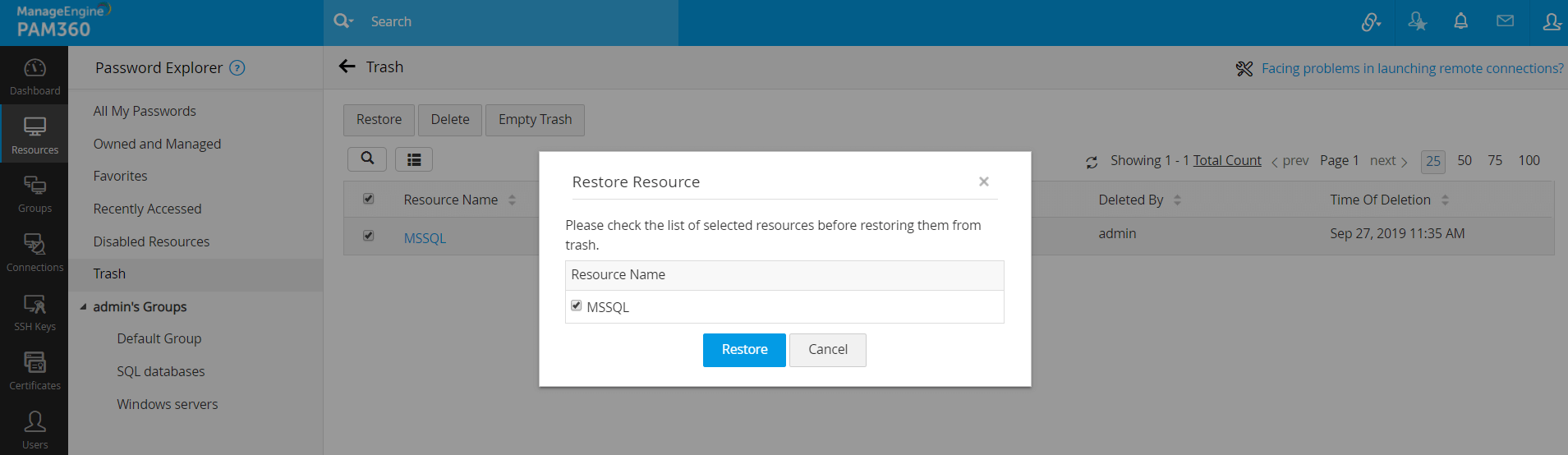 - ゴミ箱に移動されたリソースは、PAM360から削除されず、PAM360暗号化キーがローテーションされるまでいつでも復元可能です。