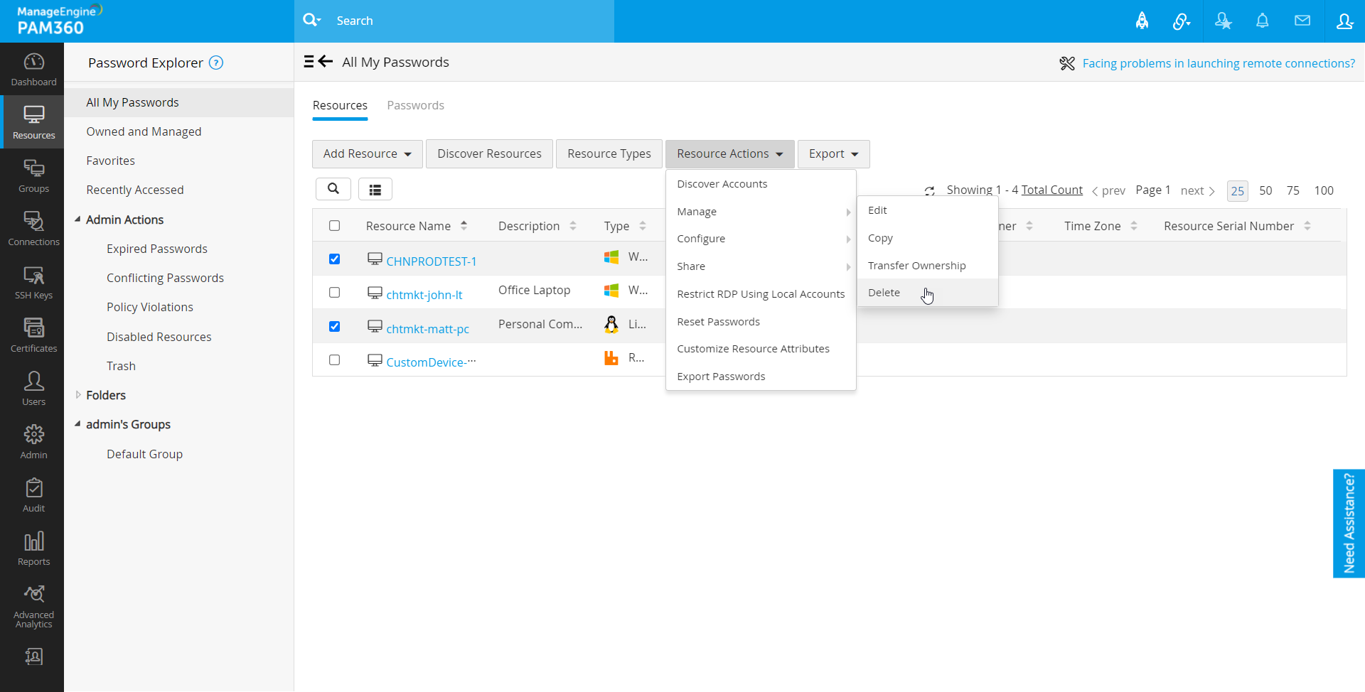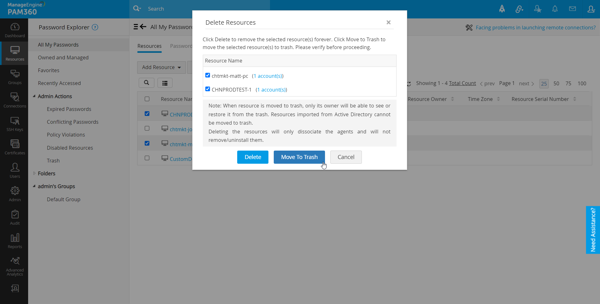 必要なくなったリソースをPAM360のリソースリストから削除するおkとができます。リソースを削除する場合は、リソースの一部だったすべてのアカウントとパスワードも永久に削除されます。また、リソースを後で復元できるゴミ箱い移動する選択ができます。