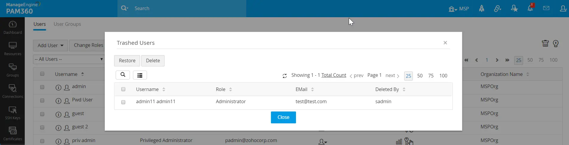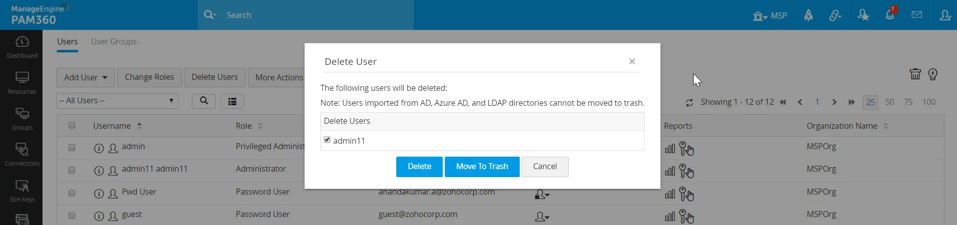 - ゴミ箱へ移動:このオプションは、ユーザーを完全に削除せずにゴミ箱に移動します。PAM360
