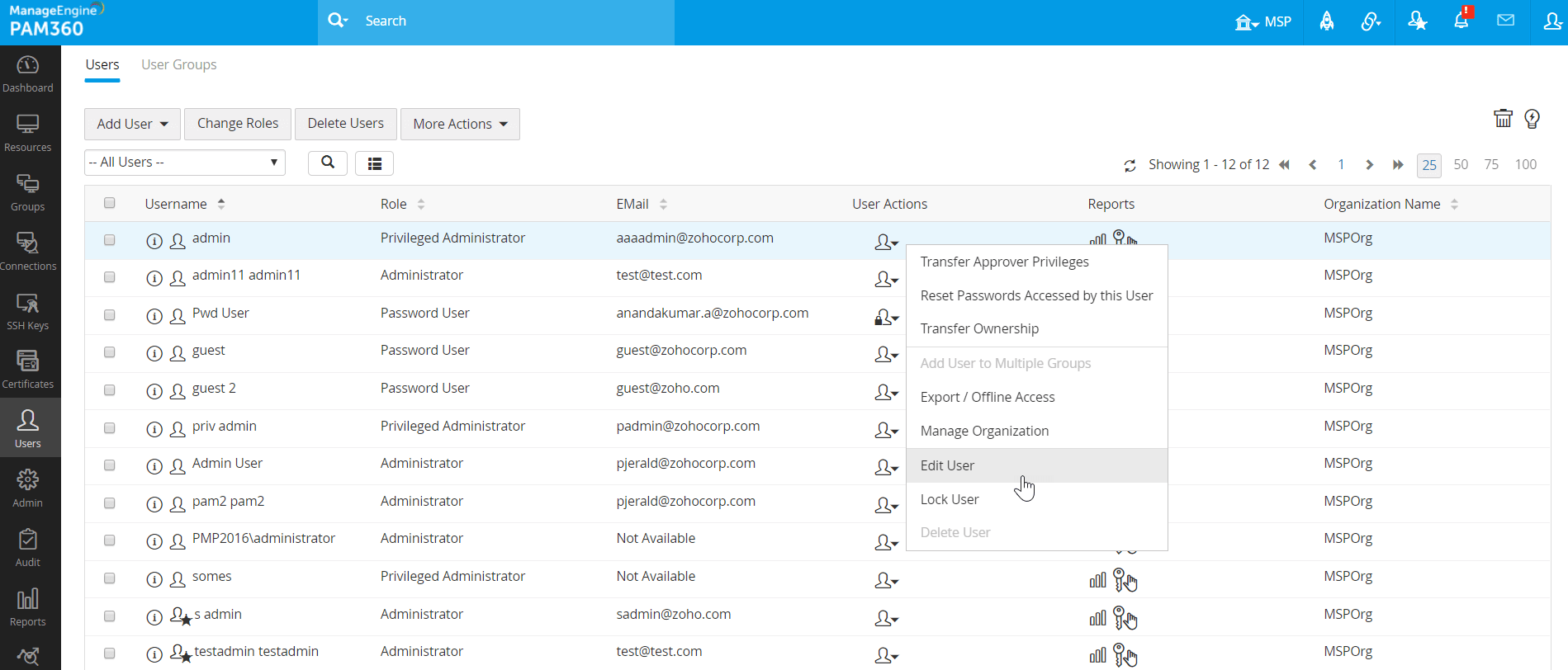 - 希望のユーザーで[ユーザー操作]アイコンをクリックし、[ユーザーを編集]をドロップダウンリストから選択します。