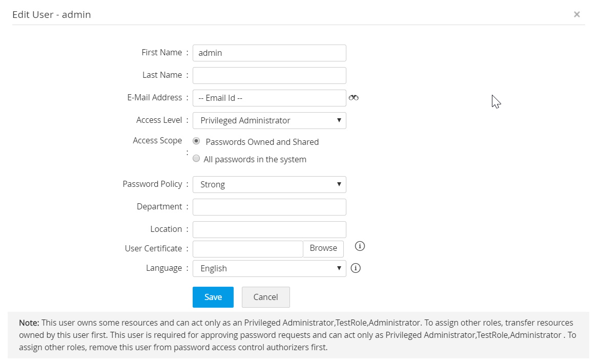 メモ:あなたが管理者である場合、アクセスレベルまたはスコープは、現在ログインしている管理者のアクセスレベルを変更できないため、変更できません。そのため、別の管理者にその変更を要求する必要があります。