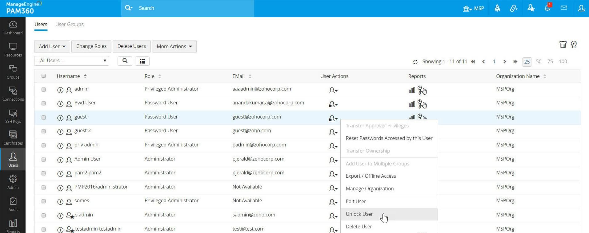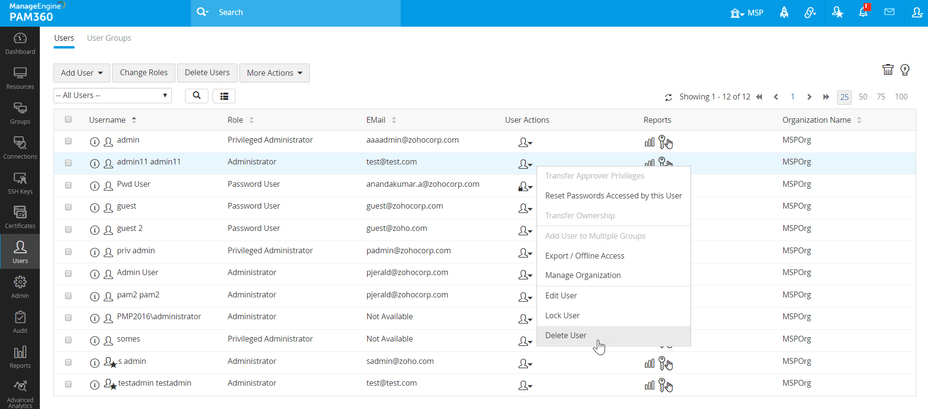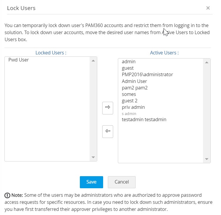- PAM360では、ユーザー/ユーザー群がリースを所有していない場合のみ、ユーザーを削除できます。ユーザーがリソースを所有している場合、すべてのリソースの所有権を管理者タイプのロールがある一部の他のユーザーに転送する必要があります。