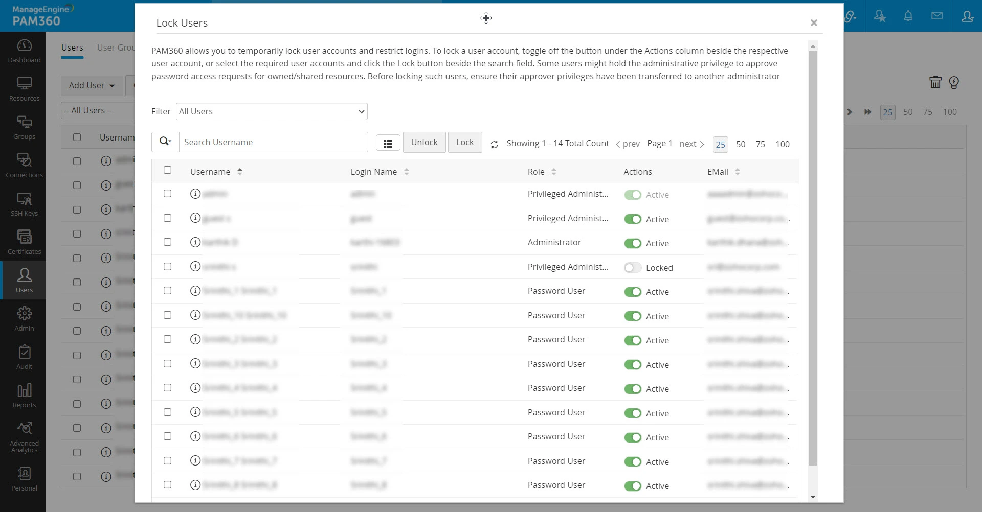 管理者はロックされたアカウントを確認し、[削除] ボタンをクリックしてそれらのユーザー アカウントを PAM360 から完全に削除することを選択できます。さらに、管理者は、[ユーザー] ページに用意されている プルダウンメニューを使用してロックされたアカウントを直接確認し、無効なアカウントを個別または一括で削除することもできます。