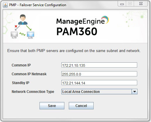 - フェールオーバーは、両方のPAM360インストールの適合性が同じ、すなわち、両方が64ビットか両方が32ビットの場合のみセットアップできます。