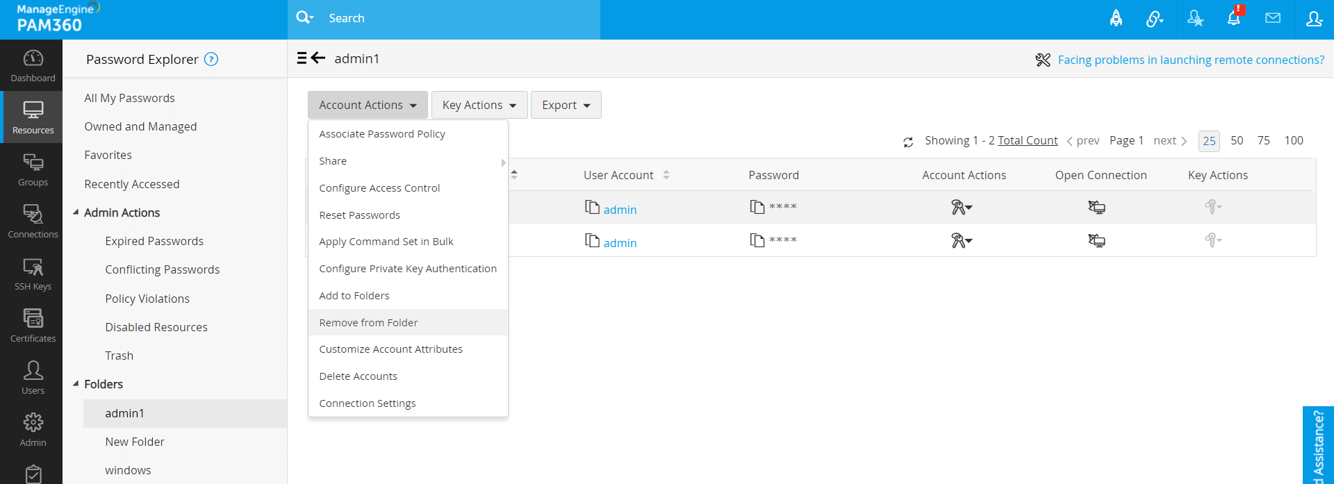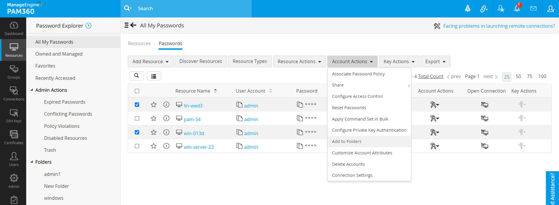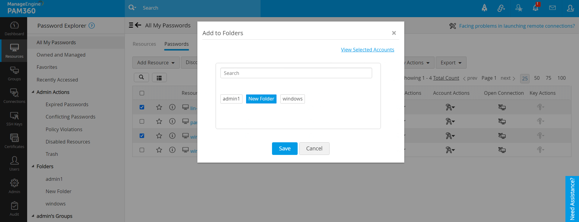 PAM360では、管理およびアクセスしやすいように、要件にあわせて、必要なアカウントをカスタムフォルダにまとめることができます。各アカウントを個別に選択するのではなく、これで、複数アカウントをフォルダに一度に選択して、そこで一括操作できます。これらのフォルダには、[リソース] タブと [接続] タブからアクセスできます。ただし、フォルダはリソースタブからのみ追加または修正でき、接続タブには、リソースタブからフォルダに行ったすべての変更が反映されます。フォルダはユーザー固有であるため、他のユーザーと共有することはできないことに注意してください。