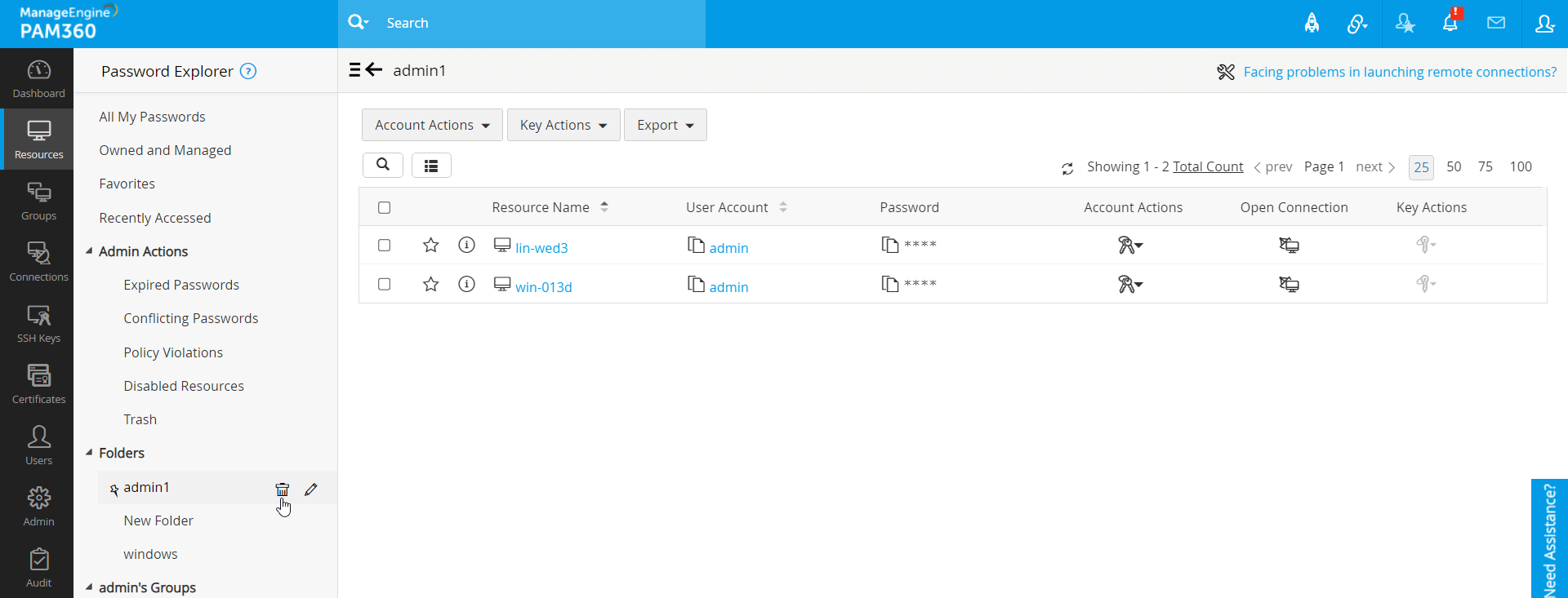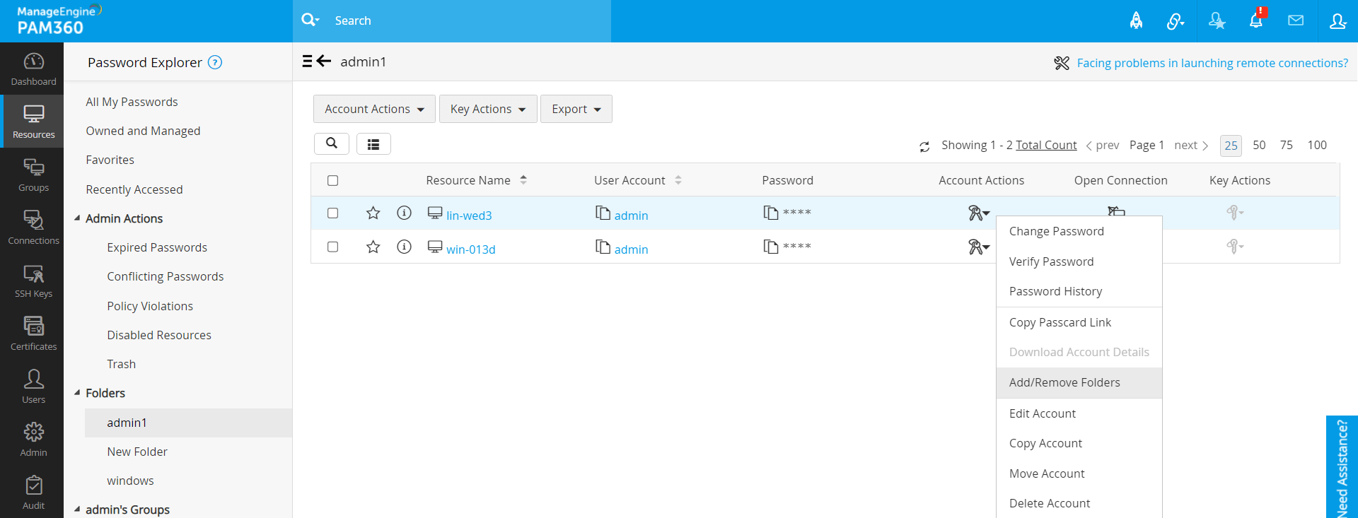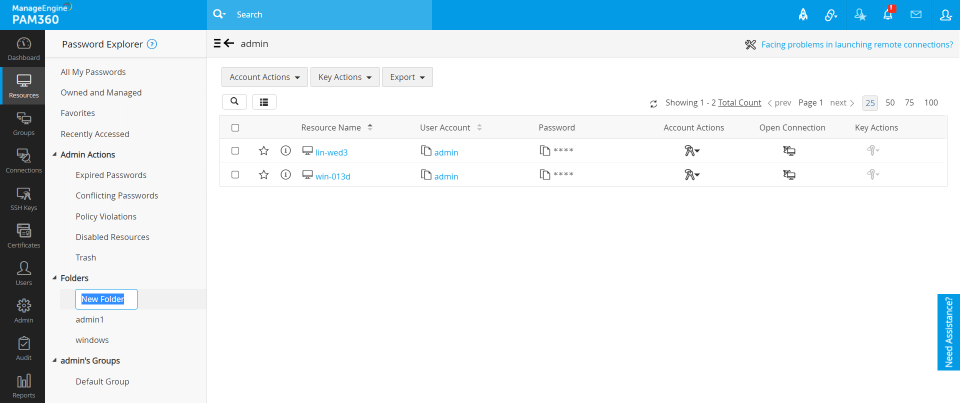PAM360では、管理およびアクセスしやすいように、要件にあわせて、必要なアカウントをカスタムフォルダにまとめることができます。各アカウントを個別に選択するのではなく、これで、複数アカウントをフォルダに一度に選択して、そこで一括操作できます。これらのフォルダには、[リソース] タブと [接続] タブからアクセスできます。ただし、フォルダはリソースタブからのみ追加または修正でき、接続タブには、リソースタブからフォルダに行ったすべての変更が反映されます。フォルダはユーザー固有であるため、他のユーザーと共有することはできないことに注意してください。