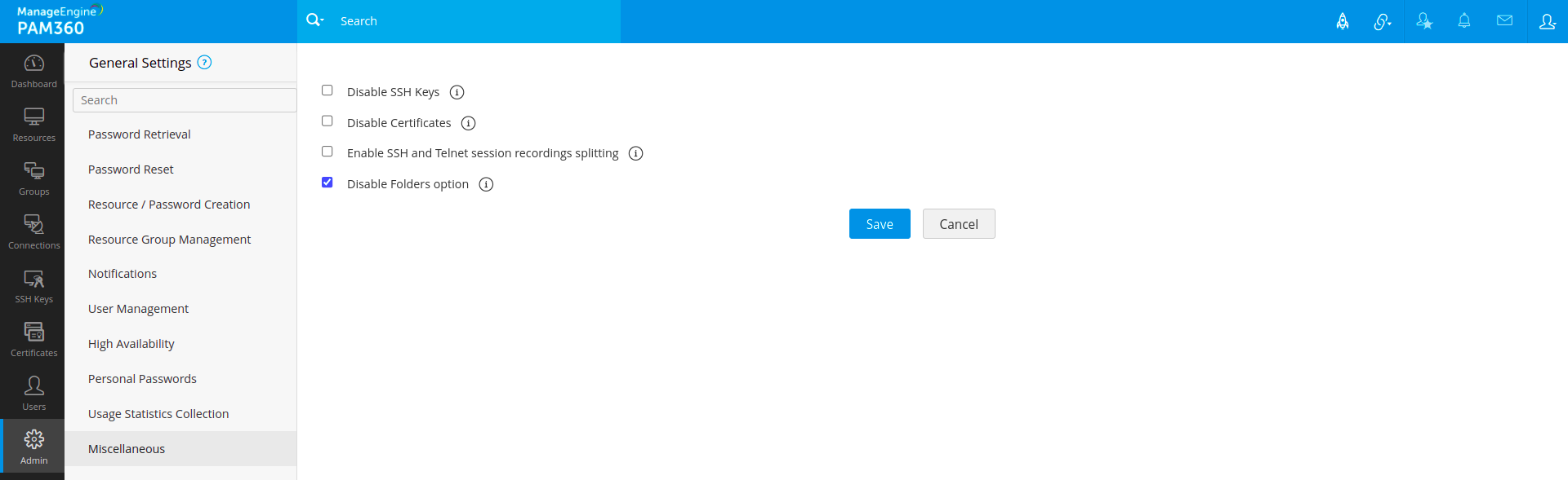 - 次に、チェックボックス[フォルダオプションを無効化]を選択し、PAM360のすべてのユーザーのフォルダ機能を無効にします。