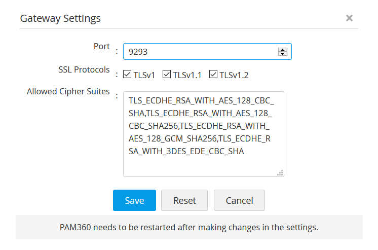 - 許可された暗号スイート: PAM360が使用する暗号スイートは以下のとおりです: TLS_ECDHE_RSA_WITH_AES_128_CBC_SHA, TLS_ECDHE_RSA_WITH_AES_128_CBC_SHA256, TLS_ECDHE_RSA_WITH_AES_128_GCM_SHA256, TLS_ECDHE_RSA_WITH_3DES_EDE_CBC_SHA. 編集は、暗号スイートをテキストフィールドに入力するだけです。.