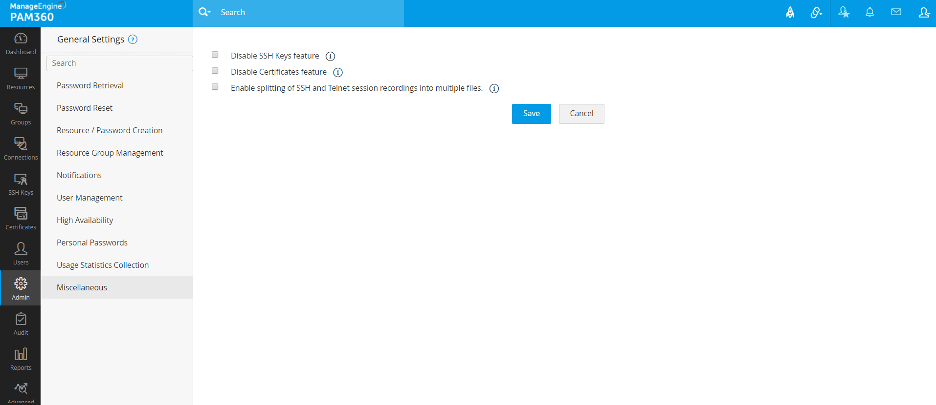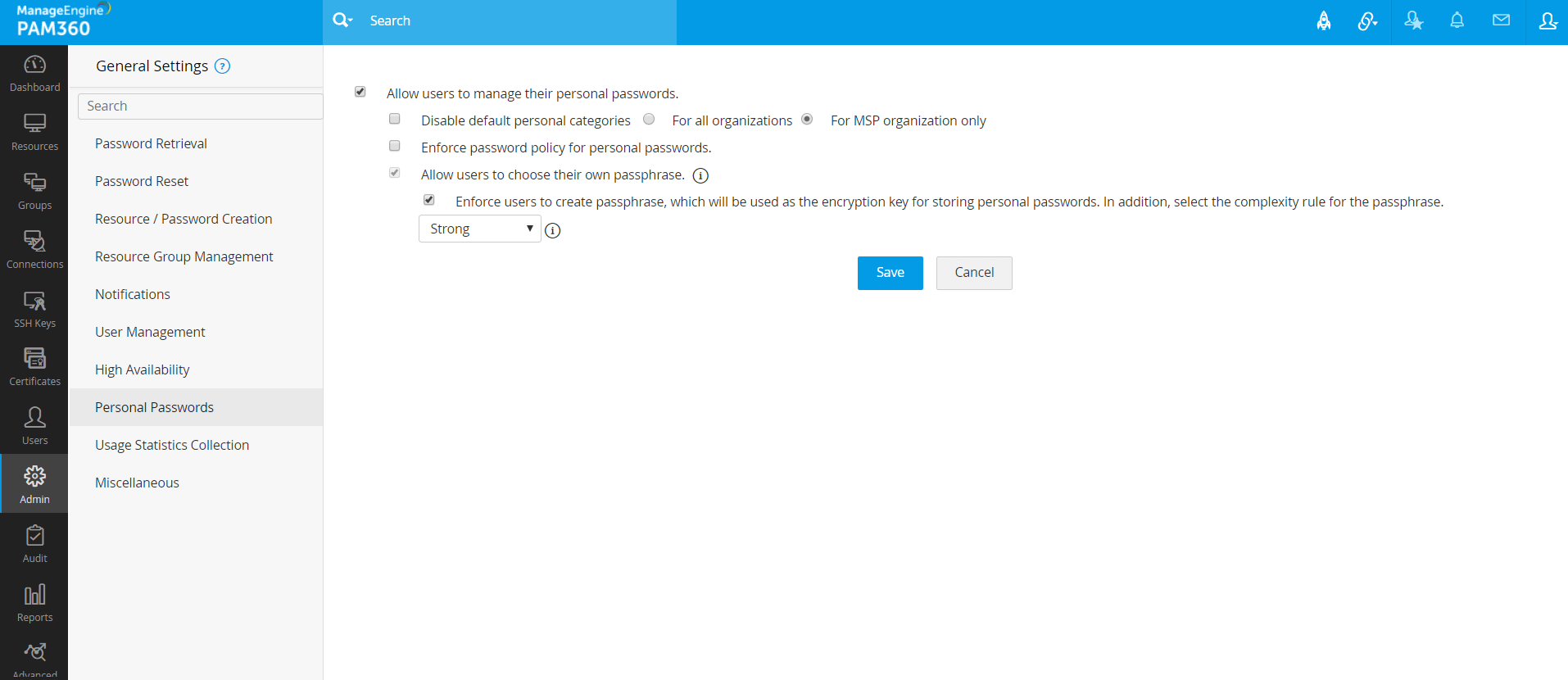 メモ:PAM360のMSPエディションでは、MSP管理者のみ、このオプションを有効または無効にできます。