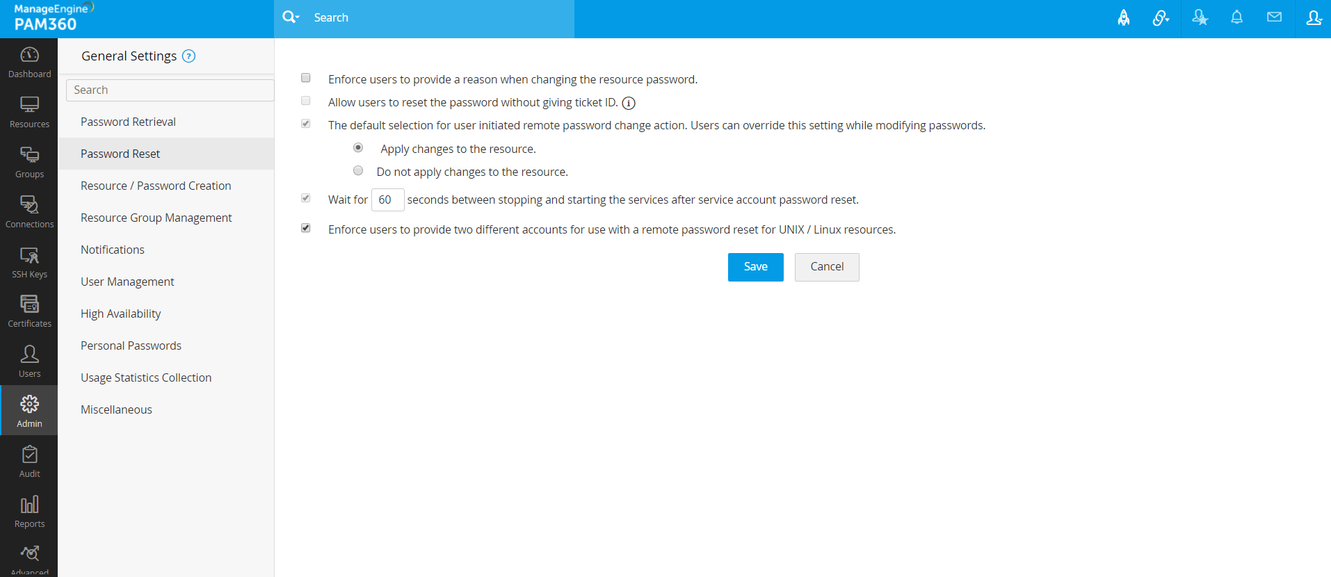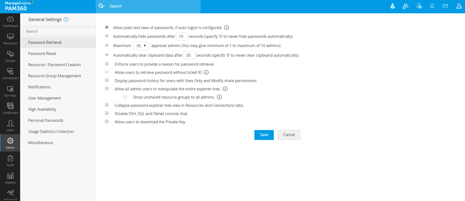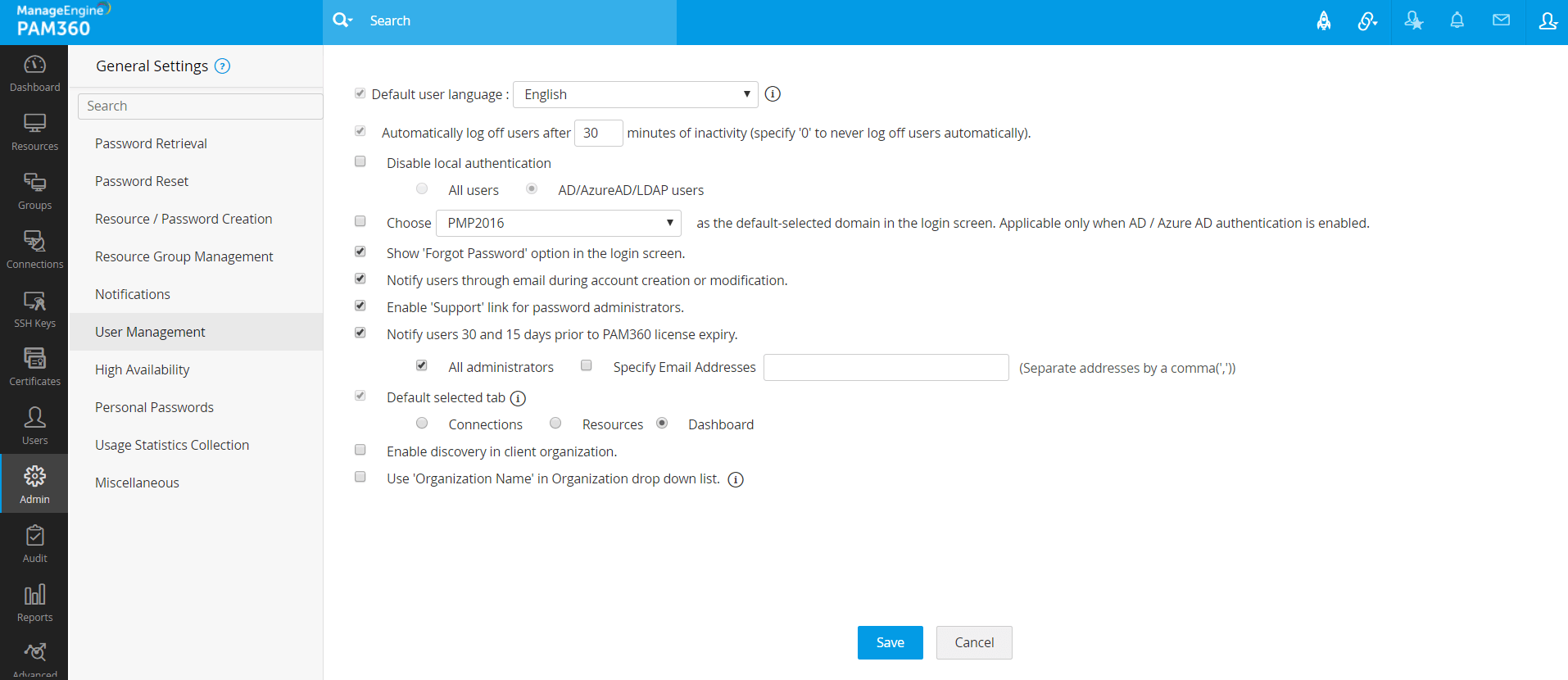 PAM60の全般設定セクションを使って、パスワードポリシーの実行、パスワードを忘れたオプションの有効化で、ユーザーパスワードをリセット、ユーザー作成またはロール修正時のメール通知送信の構成、個人パスワードの管理のプロビジョン、リソースのエクスポート、リモートパスワードリセット等、重要な設定変更を実行できます。