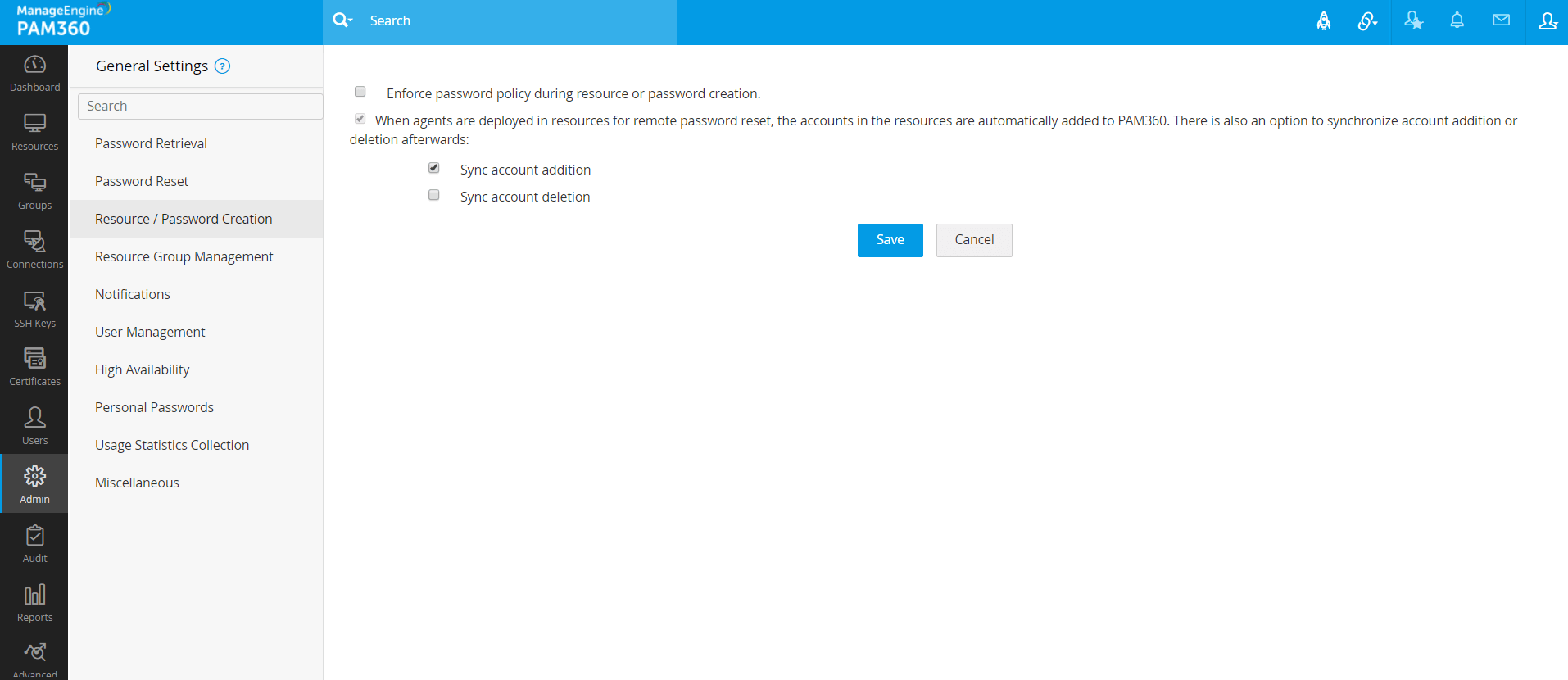 このオプションを有効にして、新しいアカウントがリモートリソースに削除されたときに必ず、PAM360に削除できます。