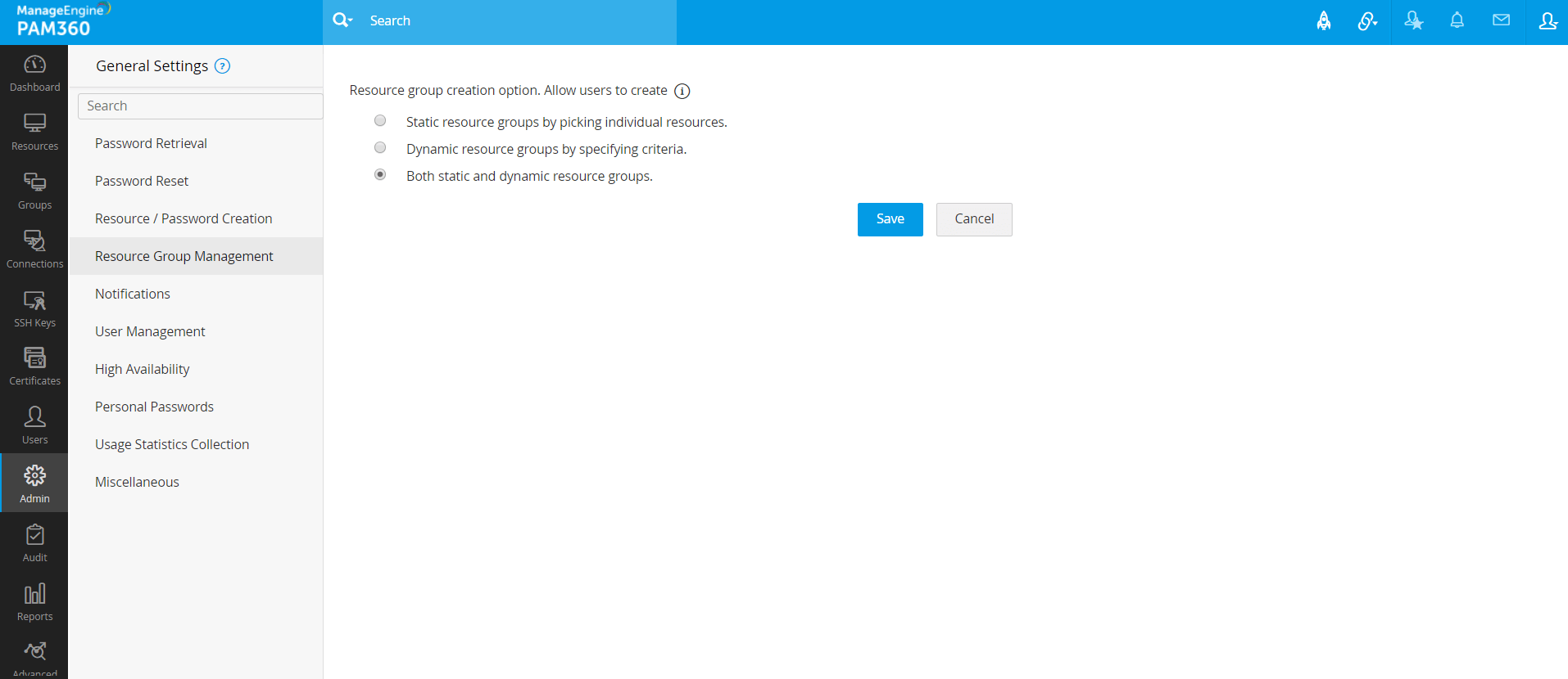 PAM360のリソースグループ管理に関連したすべてのグローバル設定を表示および管理するには、左ペインの[リソースグループ管理]をクリックします。