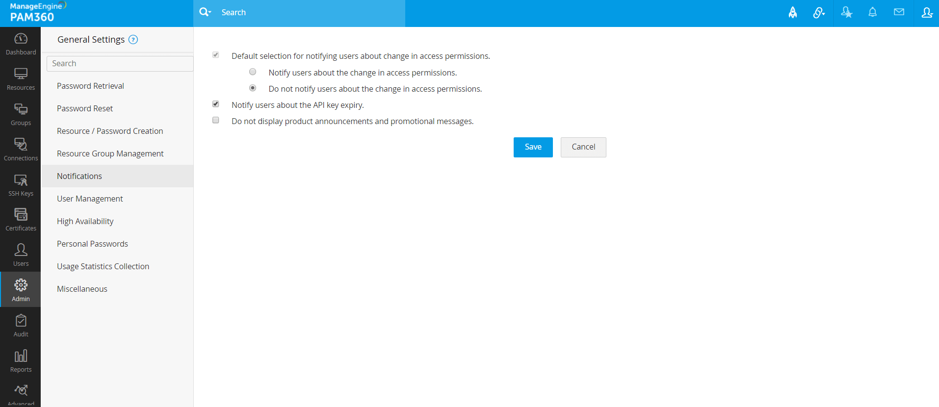 PAM360の通知に関連したすべてのグローバル設定を表示および管理するには、左ペインの[通知]をクリックします。