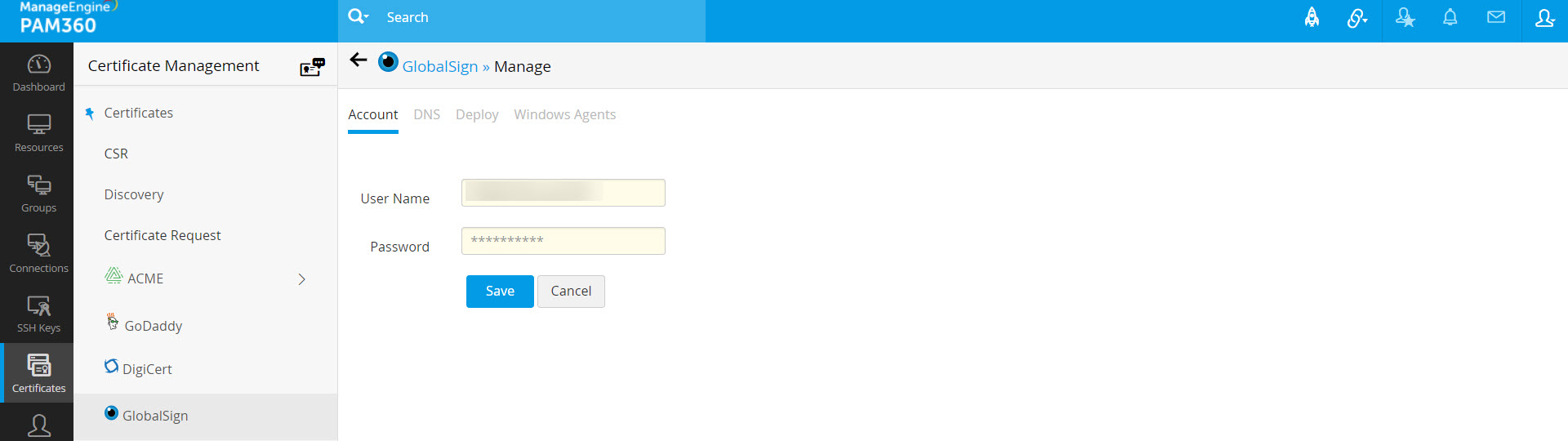 次に、PAM360インターフェイスで、下の手順にしたがって、GoDaddy DNSをGlobalSign証明書リポジトリに追加します: