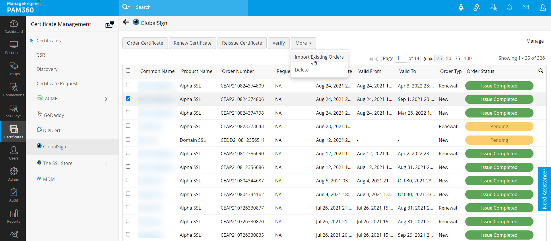 注記:証明書要求が削除されると、PAM360のみから削除されます。オーダーがお使いのアカウントにGlobalSign Webサイトで開き、必要な場合、PAM360に、[GlobalSign] >> [その他] >> [既存のオーダーをインポート]でインポートできます。.