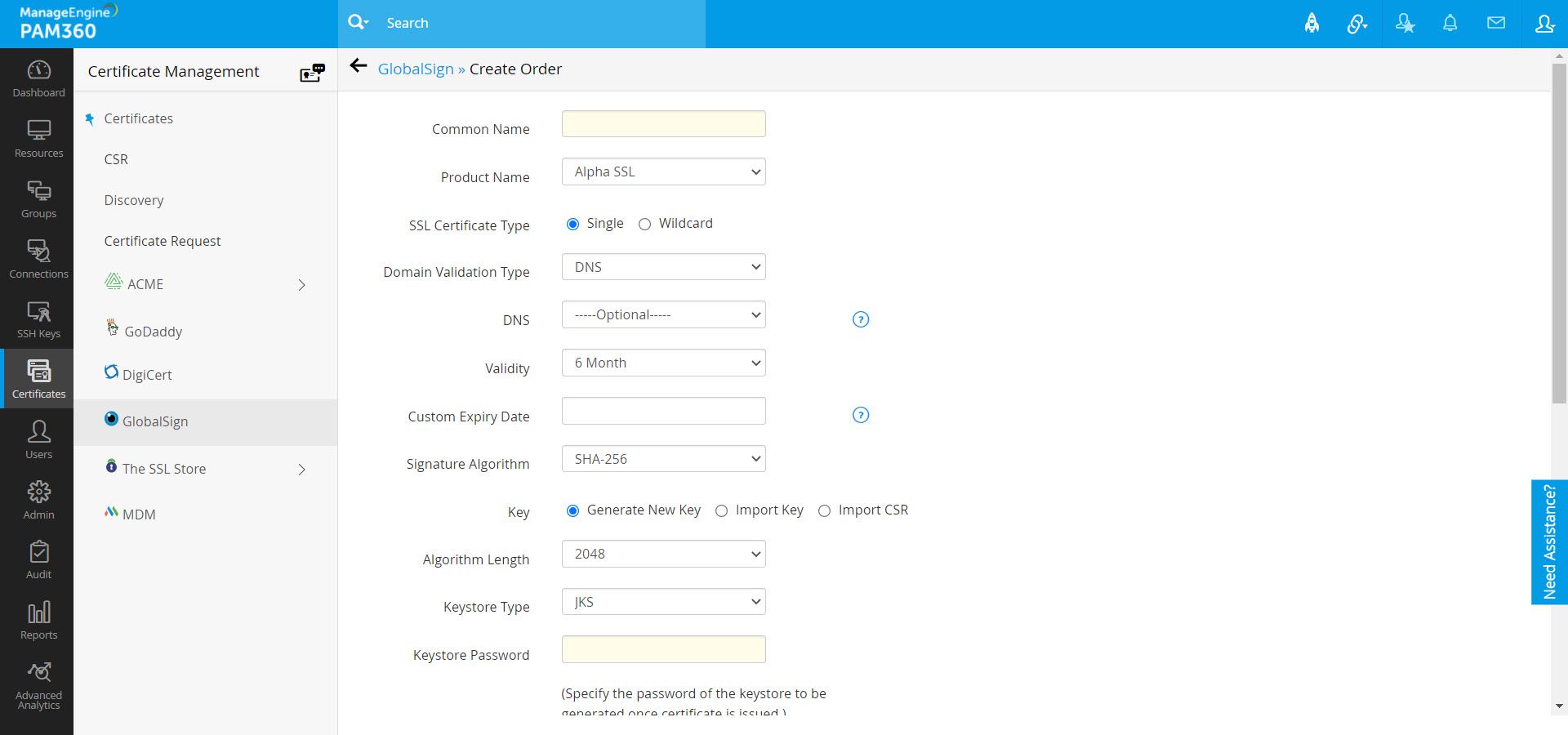GlobalSign認証情報を構成したら、GlobalSignのAPIを利用して、証明書サイニング要求(CSRs)を生成し、PAM360から直接オーダーを実行、証明書を取得および管理できます。