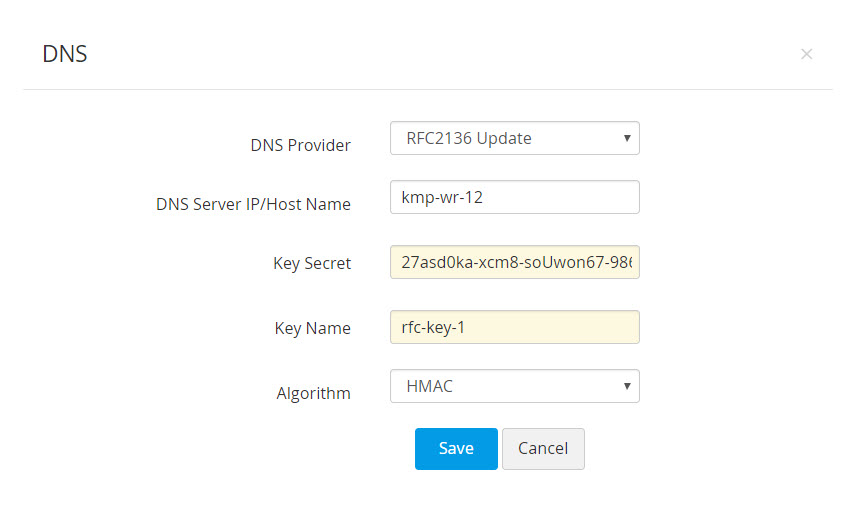 - RFC2136 DNS更新の場合、グローバルDNS構成を選択した場合、ドメイン名自体がゾーン名として機能します(グローバルDNS構成は、すべてのゾーンに同じキーシークレットを使用している場合にのみ可能です)。一方、ドメインとエージェントのマッピングを選択した場合は、ドメインごとにゾーン名、キー名、キーシークレットを個別に指定する必要があります。