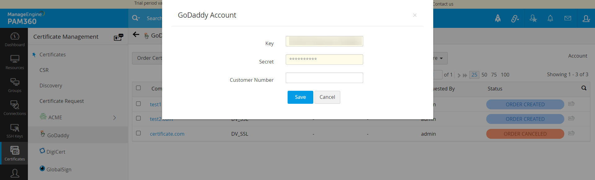 PAM360では、PAM360との統合前にオーダーした可能性がある既存の証明書をGoDaddyからインポートできます。このオプションを使って、前のGoDaddy証明書を[証明書] >> [証明書]タブにインポートし、PAM360から管理できます。