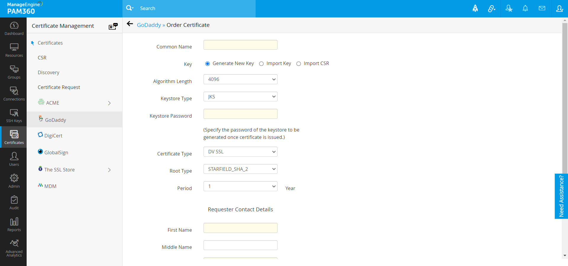 アカウントをセットアップした後、SSL証明書をGoDaddyから取得し、その後、PAM360から証明書オーダーを実行する必要があります。