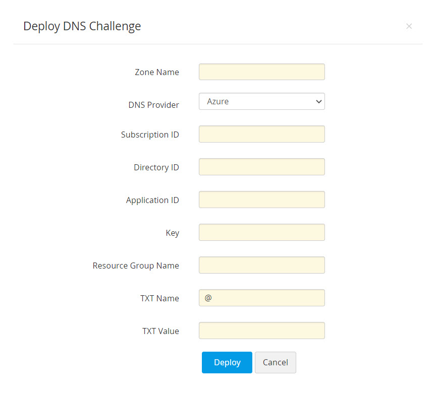 - DNSベースのチャレンジ認証によるドメイン認証の場合、DNS詳細(Azure DNS、Cloudflare DNS、Amazon Route 53、RFC2136 Update、ClouDNS、およびGoDaddy DNSについてサポート)を構成し、 DNSチャレンジを展開オプションを使って、チャレンジIDをPAM360から直接展開できます。ドメイン制御チャレンジ検証するための手順の詳しい説明はこちらをクリックしてください。