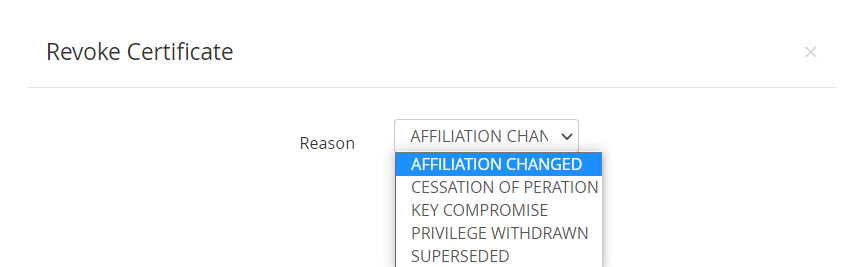 - ドロップダウンから有効な理由を選択した後、[取り消す]をクリックしてアクションを確認します。証明書タブに切り替え、証明書を削除して、PAM360リポジトリから完全削除します。