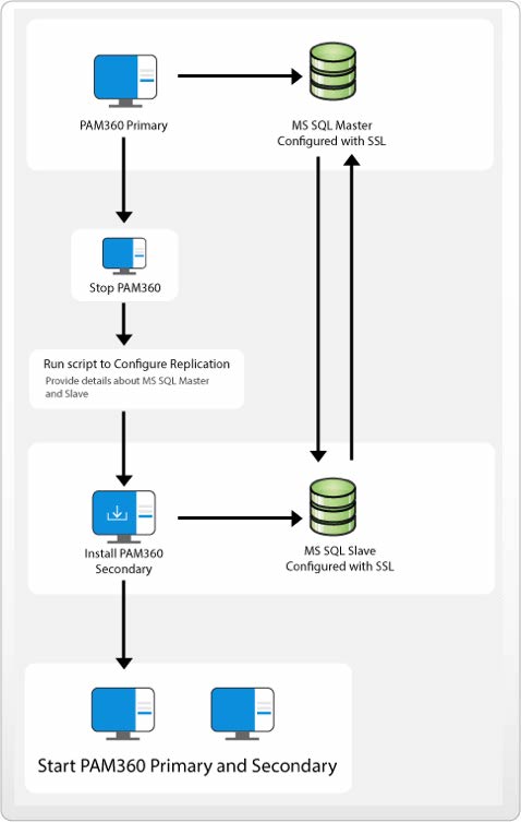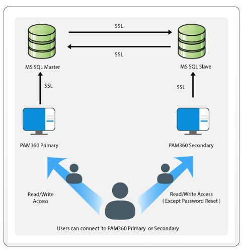 - PAM360は、SQL Serverのデータレプリケーション技法を利用して、セキュア暗号化チャンネルで生じるデータ同期化を行います。