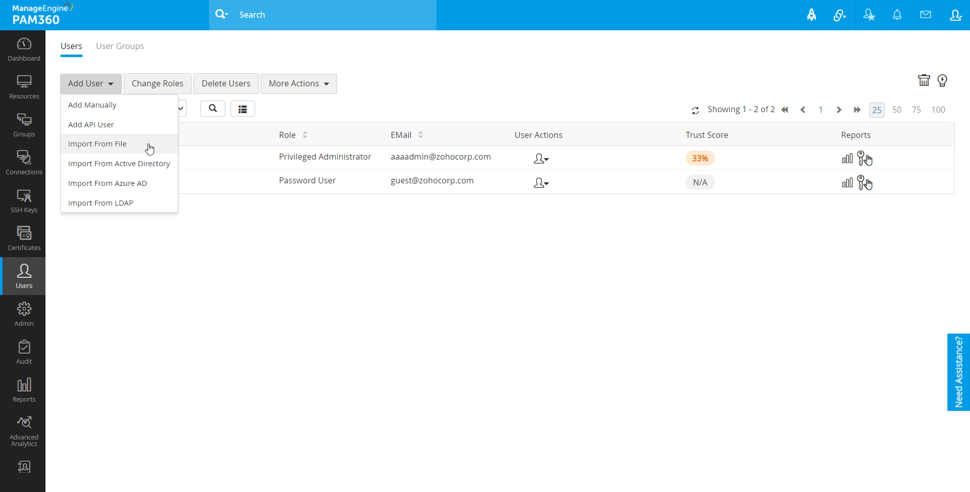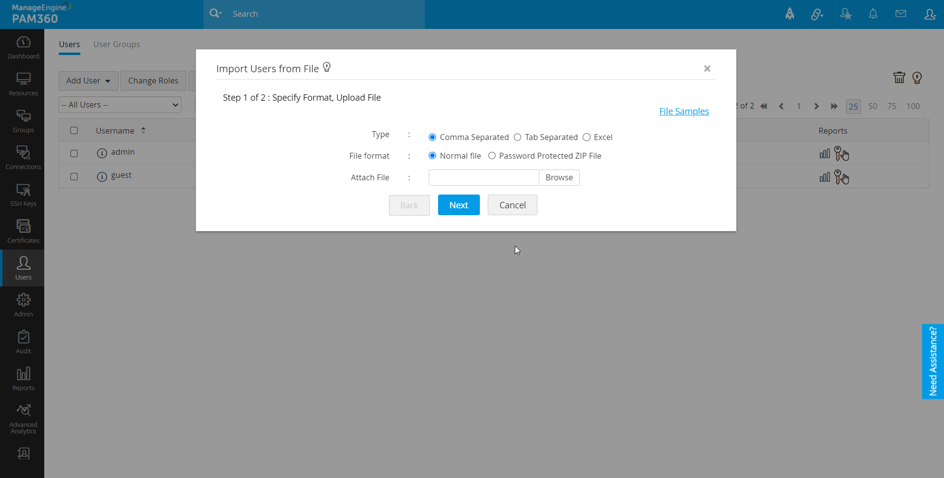 PAM360では、ユーザーをExcel、CSV、TSV、またはテキストファイルからインポートできます。サンプルファイルの表示と、インポートにサポートされているファイル形式についての詳細は、ここをクリックしてください。名、姓、ユーザー名、メールアドレス、部門、場所等の標準的な詳細事項とは別に、追加テキスト有効化/無効化を追加して、個別ユーザーに二要素認証を有効化/無効化することもできます。