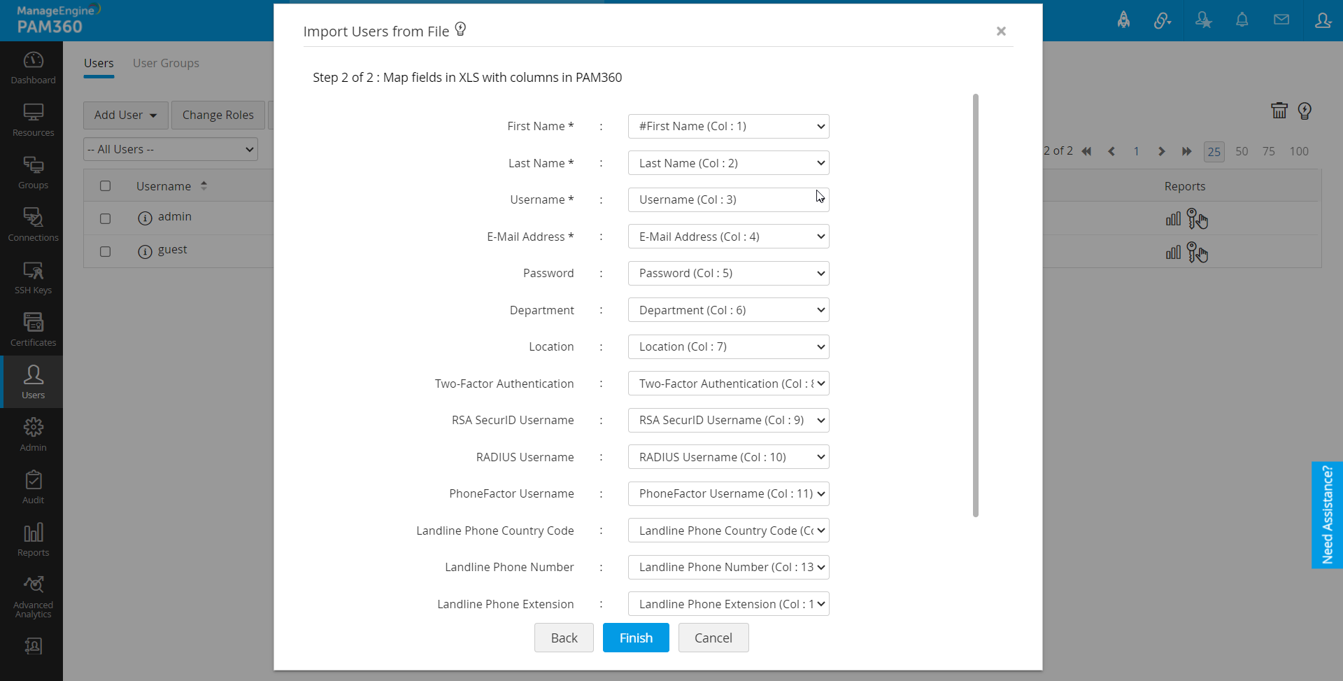 - これらの6個のうち、最初4個のフィールドは記入必須で、同内容の値がファイルに含まれている必要があります。お持ちンオファイルで、エントリは順不同にできます。インポートされたファイルのデータは、列名と一致するフィールドに自動入力されます。ファイル中のどのフィールドをPAM360ユーザーアカウントの対応する属性にマッピングするかを選択することもできます。