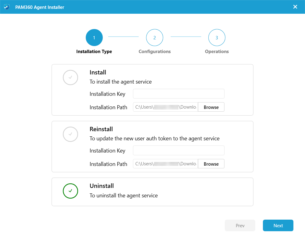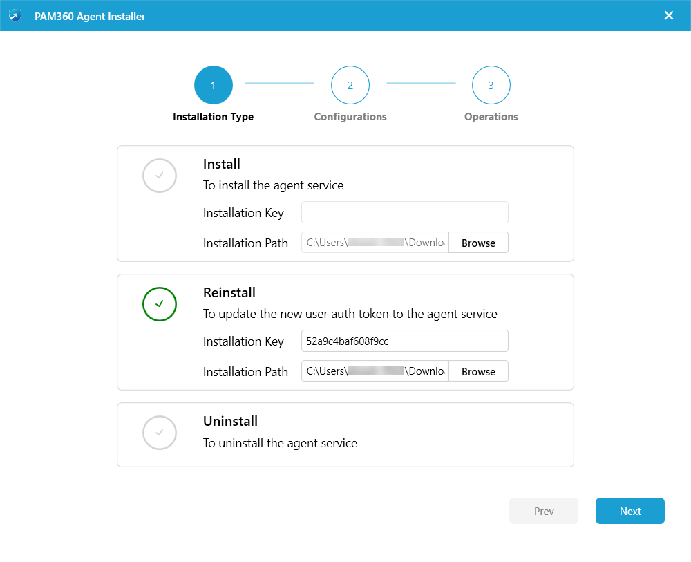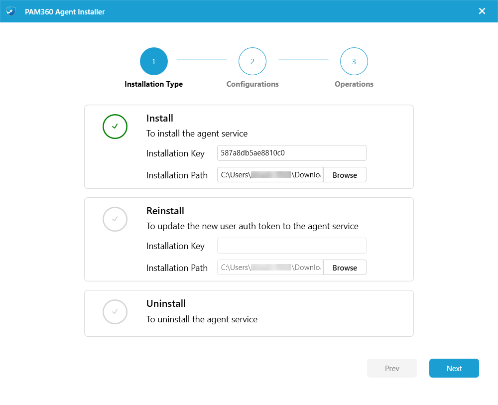 - エージェントをパスワード管理、セルフサービス権限昇格およびZero Trust実装のサービスとして更新するには、コマンド AgentInstaller.exe install <PAM360 UIからコピーしたエージェントキー>1、2、3を実行します。