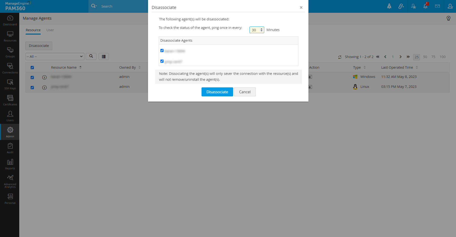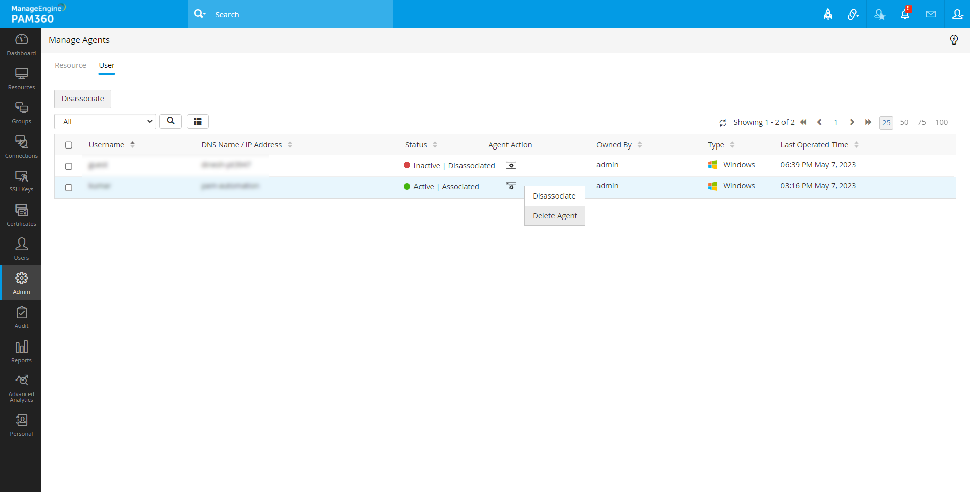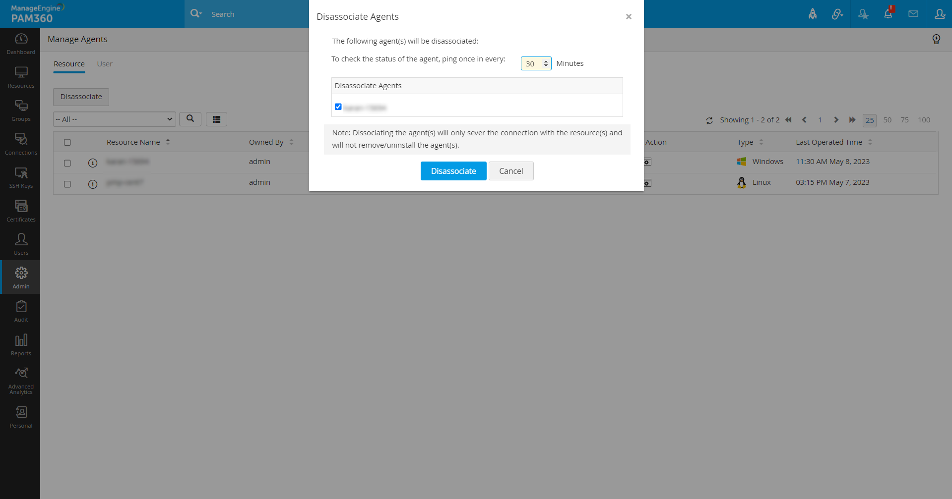 PAM360で、ユーザーは、エージェントをリソース/ユーザーに関連づけ/関連づけ解除できます。エージェントを関連づけると、エージェントは、リソース上でリモート操作を実行、またはユーザーデバイスからデータを取り込むことができ、また、エージェントを関連づけ解除すると、そこで実行したすべての操作は一時停止します。